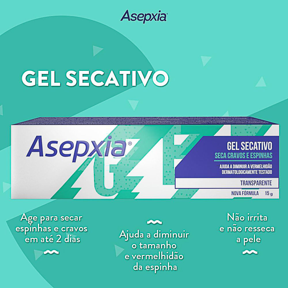 GEL SECATIVO ASEPXIA TRANSPARENTE Seca cravos e espinhas. Ajuda a diminuir a vermelhidão. Gel secativo forte para tratar a acne. O novo Asepxia gel secativo antiacne age naquela espinha inesperada, aj
