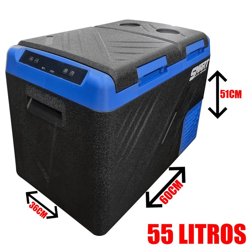 GELADEIRA CAMINHÃO PORTÁTIL 2 PORTAS 55 LITROS BLACK PREMIUM ACOMPANHA NA CAIXA: - 1 GELADEIRA - 1 CABO 12V E 24V - 1 CABO 110V E 220V - 1 FONTE LIGAÇÃO APLICAÇÃO: - CAMINHÃO - BARCO - ESCRITÓRIO - CASA - CHÁCARA - SITIO - FAZENDA - TRATOR COMPATÍVEL: - 12V - 24V - 110V - 220V FUNÇÕES E CARACTERÍSTICAS: - 2 PORTAS SENDO 1 CONGELADOR E A OUTRA REFRIGERADOR - 55 LITROS - GELADEIRA COM CONEXÃO BLUETOOTH VIA APLICATIVO - CONTROLE DE TEMPERATURA AJUSTÁVEL -20ºC ATÉ +20ºC - TAMPA REVERSÍVEL: ABRE PARA AMBOS OS LADOS - ISOLAMENTO EFICIENTE, ECOLÓGIO E SEGURO - PROTEÇÃO CONTRA BATERIA EM 3 ESTÁGIOS: EVITA DESCARREGAMENTO DA BATERIA DO VEÍCULO - MODOS DE OPERAÇÃO: RESFRIAMENTO RÁPIDO OU ECONOMIA DE ENERGIA - PORTA COPOS MEDIDAS EXTERNAS: - LARGURA: 36CM - ALTURA: 51CM - COMPRIMENTO: 60CM MEDIDAS CONGELADOR: - LARGURA: 28CM - ALTURA: 38CM - COMPRIMENTO: 26CM MEDIDAS REFRIGERADOR: - LARGURA: 29CM - ALTURA: 21CM - COMPRIMENTO: 17CM