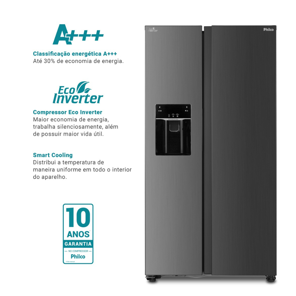 Com visual moderno e elegante que agrega muito mais requinte para a cozinha. O design side by side da Philco proporciona o aproveitamento inteligente de espaço colocando freezer e refrigerador lado a lado, valorizando o espaço vertical e garantindo a alta capacidade de 513 litros. O produto possui 4 funções diferentes de operação | Smart, Eco, Turbo Refrigeração e Turbo Congelamento. Através do modo Smart e Eco o aparelho trabalha de forma mais econômica e por meio da Turbo Refrigeração/Congelamento é possível aumentar a performance para refrigeração e congelamento mais rápido Elegante display digital que possibilita acompanhar as temperaturas e funções selecionadas. Por meio do controle de temperatura e funções é possível selecionar as temperaturas individuais do refrigerador e freezer além de selecionar as funções disponíveis Característica do Produto • Capacidade de 513L (344L no refrigerador e 169L no freezer) • Classificação "A+++" em eficiência energética • Sistema de refrigeração Frost Free • Painel touch com display LCD • Controle de temperatura do freezer e refrigerador de forma independente • Freezer com temperaturas de -14°C a -22°C (turbo freezer -25°C) • Refrigerador com temperaturas de 2 a 8°C • Funções Eco, férias, turbo freezer e turbo refrigerador • Alarme de porta aberta • Água e gelo na porta • Filtro de água com vida útil de 3785L ou 6 meses • Fabricador de gelo automático (em cubos ou triturado) • Porta em aço com tratamento anti-corrosão • Puxador embutido nas portas • Prateleiras em vidro temperado • Iluminação interna LED • Disponível em 127V e 220V • Compressor Inverter proporcionando mais economia • Marca: Philco • EAN 127V: 7899963915055 • EAN 220V: 7899963915062 • Dimensões do item com embalagem em mm Peso: 99 kg Altura: 1862 Largura:972 Comprimento:770 • Dimensões do item sem embalagem em mm Peso: 92 kg Altura: 1775mm Largura: 905mm Comprimento:650 Comprimento item aberto: 1110mm Garantia 12 meses