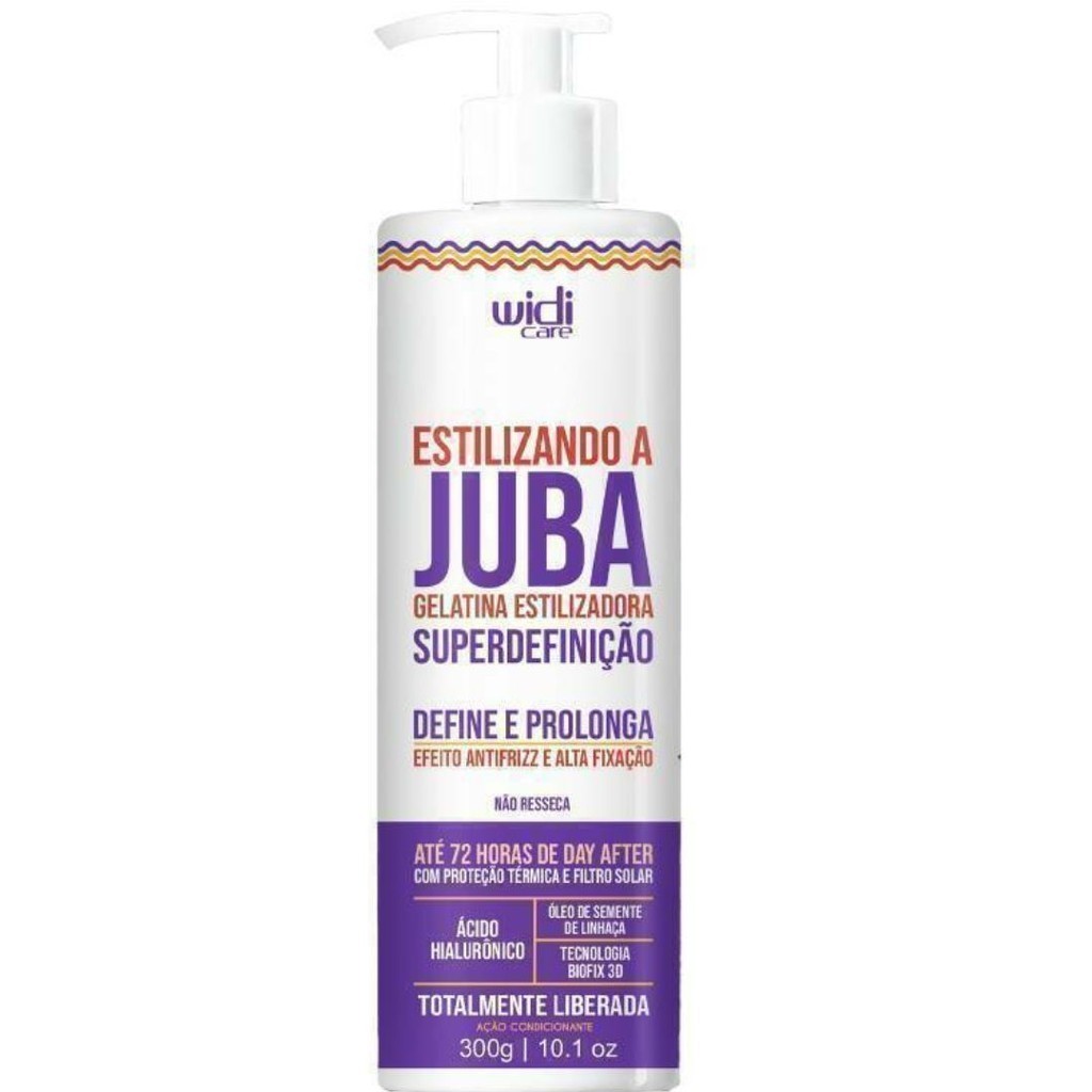 Gelatina Widi Care Juba Estilizando a Juba Super Definição 300g A Gelatina Widi Care Estilizando a Juba Super Definição 300g é um finalizador capilar desenvolvido para proporcionar alta definição, hidratação e brilho aos cabelos cacheados e crespos (curvaturas 3A a 4C). Sua fórmula contém ativos vegetais que atuam no interior da fibra capilar, promovendo emoliência e controle do frizz. ✨ Características Principais Definição e Hidratação: Proporciona cachos bem definidos e hidratados, com brilho acetinado. Ativos Principais: Óleo de Coco: Possui alto teor hidratante, conferindo brilho e maciez aos fios. Óleo de Linhaça Dourada: Rico em ômega 3 e 6, proporciona condicionamento e brilho acetinado. Extrato de Avelã: Possui ação emoliente, atuando no interior da fibra capilar. pH: 5,5 – 6,5 Indicação: Cabelos cacheados (3A, 3B, 3C) e crespos (4A, 4B, 4C) Livre de Crueldade: Sim Vegano: Sim