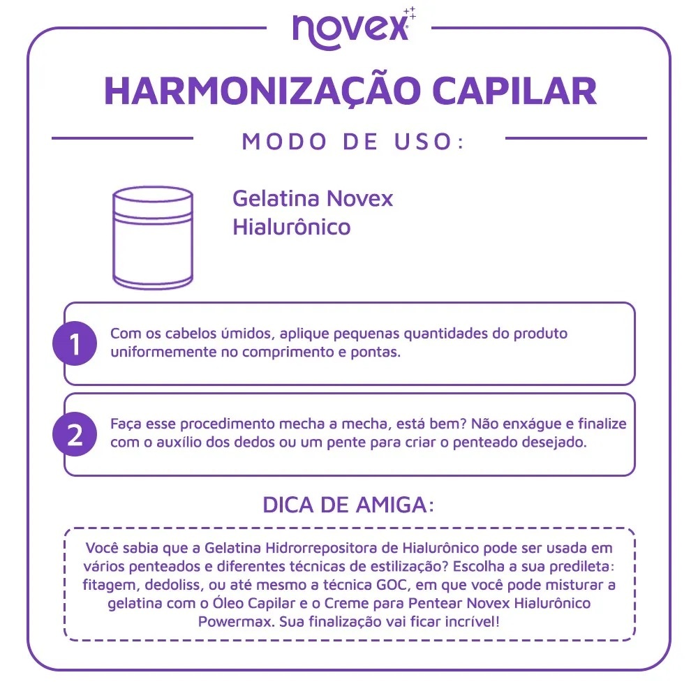 Sobre o produto: O poder do hialurônico pra dar vida nova aos cabelos Quando os cabelos vão ficando porosos, ressecados ou quebradiços, você precisa dar a eles aquela super injeção de vida, tão poderosa como você. A fórmula única dessa gelatina traz a tecnologia avançada do hialurônico, que atrai e retém a água no interior dos fios, hidratando profundamente. Oferece também uma combinação de aminoácidos que repõem a massa capilar, tratam os danos, aumentam a densidade e previnem o envelhecimento precoce. É cabelo novo e vida nova pra você continuar arrasando! *Comparada com mechas sem tratamento. Indicação: Ideal para cabelos cacheados e crespos. Ação: A fórmula única dessa gelatina traz a tecnologia avançada do hialurônico, que atrai e retém a água no interior dos fios, hidratando profundamente. Ativos: Hialurônico PowerMax Benefícios: Ação antirressecamento 72h de Super Definição* Com filtro UV Sem Parabenos, Silicones, Pretolato Ação condicionante Fórmula Vegana Não testado em animais Resultado: Definição e revitalização para cabelos quebradiços. Modo de Uso: 1- Com os cabelos úmidos, aplique pequenas quantidades do produto uniformemente no comprimento e pontas. 2- Faça esse procedimento mecha a mecha, está bem? Não enxágue e Finalize com o auxílio dos dedos ou um pente para criar o penteado desejado. Dica de Amiga: Você sabia que a Gelatina Hidrorrepositora de Hialurônico pode ser usada em vários penteados e diferentes técnicas de estilização? Escolha a sua predileta: fitagem, dedoliss, ou até mesmo a técnica GOC, em que você pode misturar a gelatina com o Óleo Capilar e o Creme para Pentear Novex Hialurônico Powermax. Sua finalização vai ficar incrível!