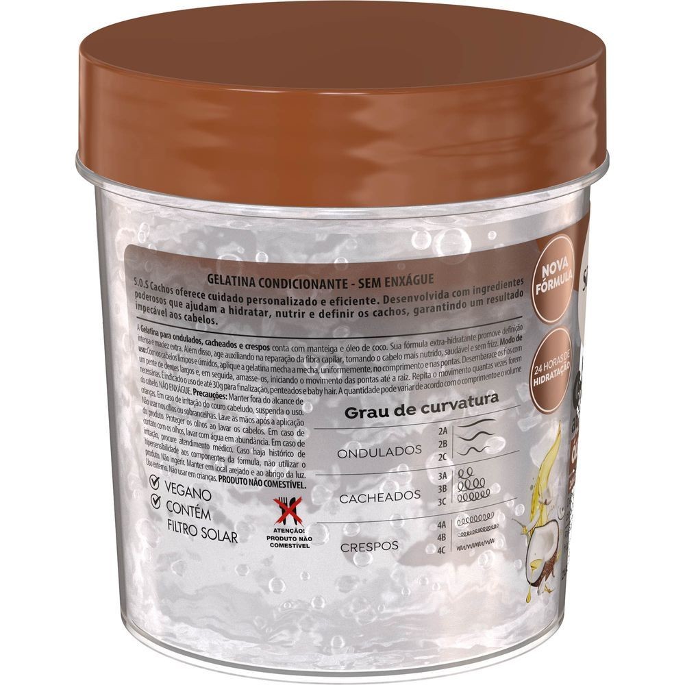 GELATINA SOS CACHOS ATIVADORA DE CACHOS ÓLEO DE COCO SALON LINE 400G ==================================================================== A Gelatina SOS Cachos da Salon Line proporciona uma definição intensa e hidratação prolongada para cabelos cacheados. Com uma fórmula vegana enriquecida com óleo de coco, ela garante cachos bem definidos e um brilho intenso. Proporciona cachos bem definidos com nutrição profunda e brilho intenso, graças ao poder do óleo de coco. Experimente a definição poderosa dos cachos com confiança, sabendo que este produto é vegano e não testado em animais, respeitando o meio ambiente. DEFINIÇÃO INTENSA E HIDRATAÇÃO PROLONGADA Proporciona cachos bem definidos com nutrição profunda e brilho intenso, graças ao poder do óleo de coco. CUIDADO ÉTICO E NATURAL Experimente a definição poderosa dos cachos com confiança, sabendo que este produto é vegano e não testado em animais, respeitando o meio ambiente. MODO DE USO =========== Para melhores resultados, aplique a Gelatina nos cabelos limpos e úmidos. Siga as etapas para garantir que seus cachos recebam o máximo de cuidado e definição. Com os cabelos limpos e úmidos, aplique a Gelatina mecha a mecha uniformemente no comprimento e nas pontas. Desembarace os fios com um pente de dentes largos, garantindo uma distribuição uniforme do produto. Amasse os cabelos iniciando o movimento das pontas até a raiz para estimular os cachos. Repita o movimento quantas vezes forem necessárias para obter a definição desejada. Não enxágue. APLICAÇÃO Com os cabelos limpos e úmidos, aplique a Gelatina mecha a mecha uniformemente no comprimento e nas pontas. DESEMBARAÇAR Desembarace os fios com um pente de dentes largos, garantindo uma distribuição uniforme do produto. AMASSAR Amasse os cabelos iniciando o movimento das pontas até a raiz para estimular os cachos. FINALIZAR Repita o movimento quantas vezes forem necessárias para obter a definição desejada. Não enxágue. CARACTERÍSTICAS E BENEFÍCIOS DA GELATINA SOS CACHOS =================================================== A Gelatina SOS Cachos oferece uma experiência única para quem busca definição e leveza nos fios. Vegana e cruelty-free, atende a consumidores conscientes. O óleo de coco fortalece os fios proporcionando brilho e maciez extrema para os cachos. Fórmula liberada que respeita diferentes rotinas capilares sem comprometer a saúde dos cabelos. Pode ser usada sozinha ou combinada com outros produtos da linha S.O.S Cachos para resultados personalizados. Deixa os cabelos leves, permitindo movimento natural sem acúmulo indesejado nos fios. NUTRIÇÃO PROFUNDA COM ÓLEO DE COCO O óleo de coco fortalece os fios proporcionando brilho e maciez extrema para os cachos. COMPATÍVEL COM TÉCNICAS LOW POO Fórmula liberada que respeita diferentes rotinas capilares sem comprometer a saúde dos cabelos. USO VERSÁTIL E DIÁRIO Pode ser usada sozinha ou combinada com outros produtos da linha S.O.S Cachos para resultados personalizados. SEM RESÍDUOS PESADOS OU SENSAÇÃO PEGAJOSA Deixa os cabelos leves, permitindo movimento natural sem acúmulo indesejado nos fios. ESPECIFICAÇÕES TÉCNICAS ======================= Este produto apresenta especificações técnicas que promovem sua eficácia na ativação dos cachos enquanto cuida da saúde capilar. Formulação: Gelatina capilar ativadora vegana. Características/Ação: Óleo de coco nutre intensamente. Sugestão de uso: Aplique em cabelos úmidos após a lavagem. Tipos de Cabelos: Cacheados, crespos e ondulados. Peso Líquido: 400g. Fórmula Vegana: Livre de ingredientes de origem animal. SOBRE A MARCA SALON LINE ======================== A Salon Line é uma marca comprometida com a qualidade e a inovação em produtos para cabelo. Com uma gama de produtos veganos e cruelty-free, a marca se destaca no cuidado ético e responsável com os cabelos. A Salon Line utiliza ingredientes que respeitam o meio ambiente. A marca investe em pesquisa e desenvolvimento para oferecer as melhores soluções capilares. A Salon Line possui uma linha completa para diferentes tipos de cabelo, atendendo a todas as necessidades. COMPROMISSO COM A SUSTENTABILIDADE A Salon Line utiliza ingredientes que respeitam o meio ambiente. INOVAÇÃO CONSTANTE A marca investe em pesquisa e desenvolvimento para oferecer as melhores soluções capilares. DIVERSIDADE DE PRODUTOS A Salon Line possui uma linha completa para diferentes tipos de cabelo, atendendo a todas as necessidades.