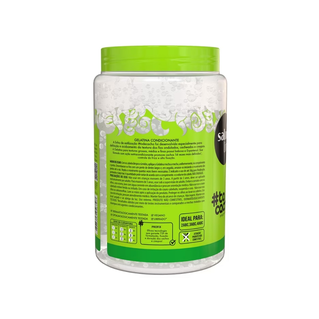 A Gelatina #todecacho Super Definição 1kg proporciona definição intensa, ação antifrizz e fixação total para os cabelos cacheados e crespos. Ideal para misturinhas. Quais os principais ativos? A Gelatina para cabelo ondulado, cacheado e crespo possui babosa e D-pantenol em sua fórmula que garantem hidratação, maciez e brilho. Além disso, aliados à tecnologia PROFIX, proporcionam definição intensa, combate ao frizz e fixação duradoura. Modo de Uso Com os cabelos limpos e úmidos, aplique a Gelatina Capilar Super Definição mecha a mecha, uniformemente, no comprimento e pontas. Desembarace os fios com um pente de dentes largos e, em seguida, amasse-os iniciando o movimento das pontas até a raiz. Repita o movimento quantas vezes forem necessárias. A aplicação ideal dependerá da quantidade e do comprimento dos fios. Não enxágue. Dicas de uso Experimente misturar a Gelatina #todecacho Super Definição com seu Ativador de Cachos Salon Line preferido para melhores resultados. É vegano? O produto é vegano. É liberado? O produto é liberado.