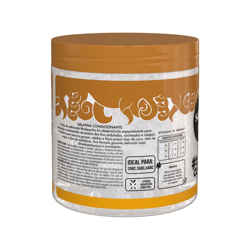 A Gelatina #todecacho Nutritiva proporciona definição total, utradesembaraço e movimento aos fios. <>INDICAÇÕES$& Para quais tipos de cabelo? Cabelos ondulados, cacheados e crespos. Qual a indicação? Cabelos frisados e desnutridos. Pode usar a partir de quantos anos? A partir de 12 anos. <>ATIVOS$& Quais os principais ativos? A Gelatina para cabelo ondulado, cacheado e crespo possui óleo de argan e óleo de amêndoas. Sua fórmula garante definição total, ultradesembaraço e movimento. <>MODO DE USO$& Qual a melhor forma de usar? Com os cabelos limpos e úmidos, aplique a gelatina mecha a mecha, uniformemente, no comprimento e pontas. Desembarace os fios com um pente de dentes largos e, em seguida, amasse-os iniciando o movimento das pontas até a raiz. Repita o movimento quantas vezes forem necessárias. A aplicação ideal dependerá da quantidade e do comprimento dos fios. Não enxágue. <>CARACTERÍSTICAS$& É produto vegano? O produto é vegano. É liberado? O produto é liberado.
