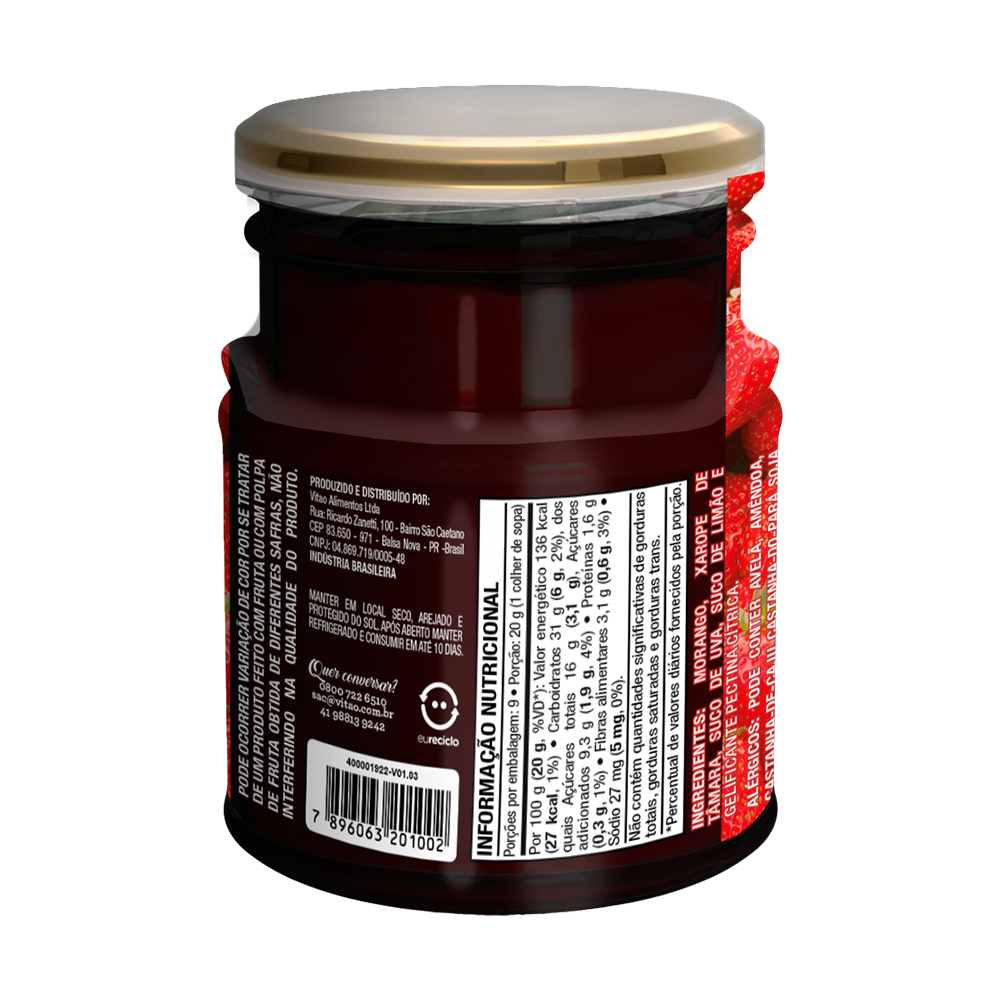 A Geleia Delakasa 100% Morango é feita com morangos frescos e de alta qualidade, garantindo o verdadeiro sabor da fruta. Adoçada com suco de tâmaras, essa geleia é perfeita para quem busca reduzir o consumo de açúcar, mantendo o prazer de saborear um produto delicioso e natural. Uma opção saudável e nutritiva para qualquer momento do dia. INGREDIENTES: Morango, xarope de tâmara, suco de uva, suco de limão e gelificante pectina cítrica. ALÉRGICOS: PODE CONTER AVELÃ, AMÊNDOA, CASTANHA-DE-CAJU, CASTANHA-DO-PARÁ, SOJA E AVEIA (SEM GLÚTEN). NÃO CONTÉM GLÚTEN. SEM GLÚTEN, 100% FRUTA.