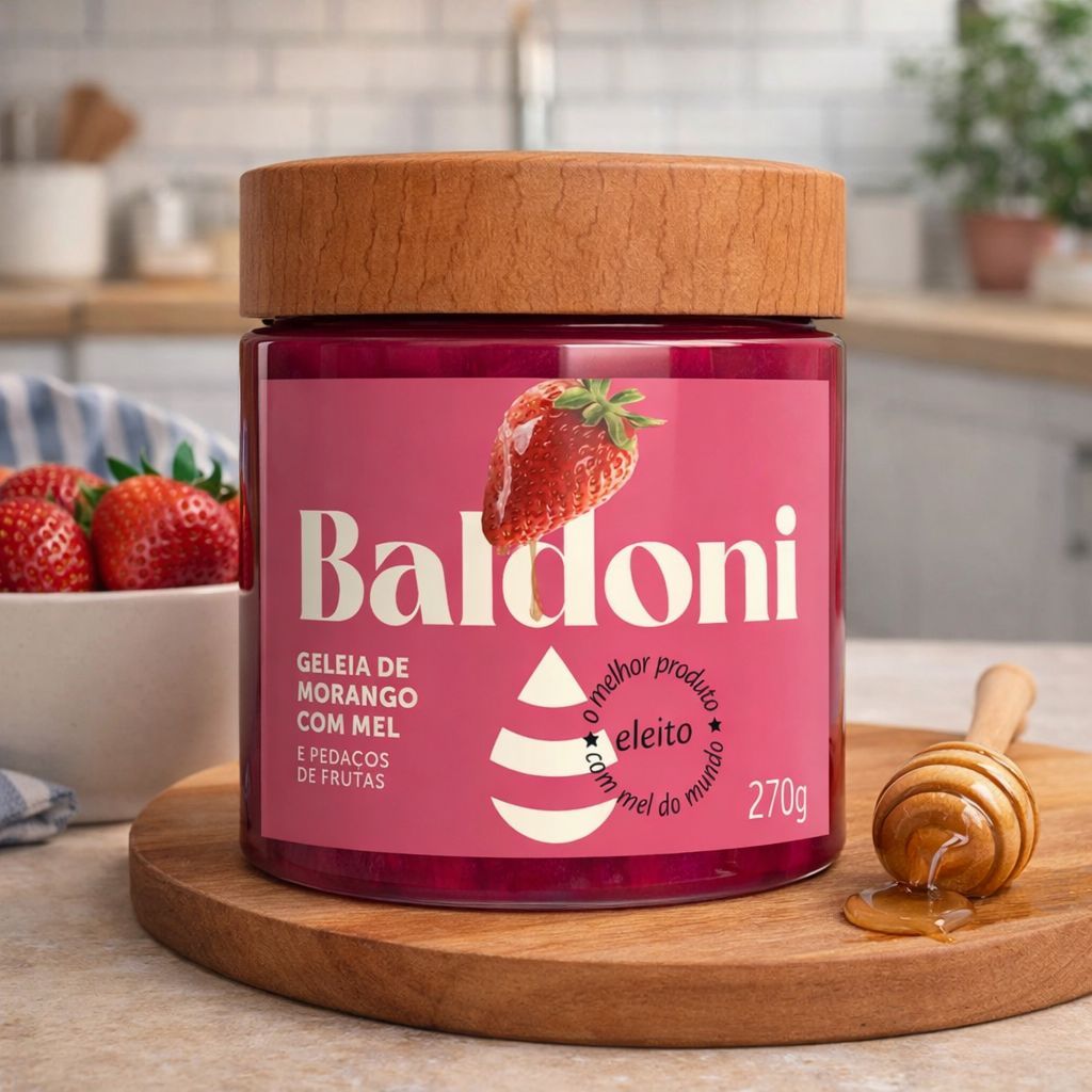 Geleia Baldoni com Mel – Sabores Naturais | 270g Descubra o sabor irresistível da Geleia Baldoni com Mel, feita com ingredientes selecionados, frutas de verdade e o toque especial do mel. Uma combinação perfeita para deixar seus momentos ainda mais saborosos. Ideal para acompanhar pães, torradas, bolos, panquecas, queijos ou para usar em receitas especiais. Sabores disponíveis: Morango com Mel Frutas Vermelhas com Mel Frutas Amarelas com Mel Abacaxi e Pimenta com Mel Informações do Produto: Marca: Baldoni Tipo: Geleia com mel e pedaços de frutas Peso líquido: 270g Embalagem: Pote de vidro com tampa de madeira Contém pedaços de frutas Produto de alta qualidade e sabor equilibrado