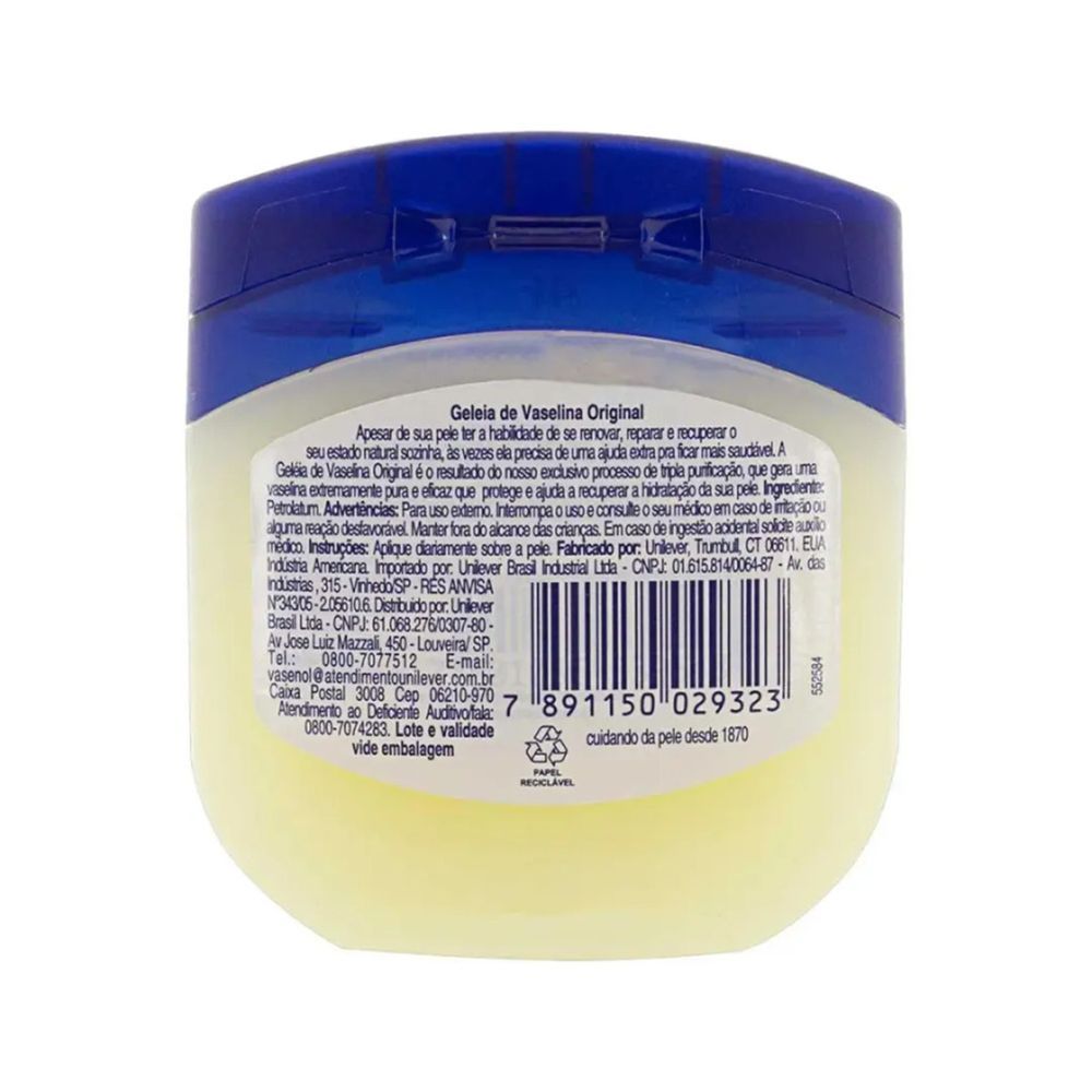 • Geleia de vaselina 100% pura, com fórmula triplamente purificada para garantir máxima pureza, segurança e eficácia. • Cria uma barreira protetora que auxilia na recuperação de pequenos cortes, rachaduras e áreas sensíveis à pele. • Hipoalergênico, dermatologicamente testado e não comedogênico, seguro para todos os tipos de pele. • Versátil para hidratar e proteger rosto, corpo e áreas delicadas como lábios, cutículas, tatuagens e pós-procedimentos dermatológicos. • Textura suave de fácil aplicação, mantém a pele hidratada por mais tempo, promovendo maciez, conforto e aparência saudável. • Geleia de vaselina Vasenol indicada para toda a família, ideal para uso diário e cuidados especiais. A Geleia de Vaselina Original Vasenol é o cuidado clássico que oferece hidratação intensa, proteção e recuperação para a pele seca e sensível. Sua fórmula passa por um processo exclusivo de tripla purificação, que envolve hidrogenação para remover impurezas químicas, filtração para eliminar partículas sólidas e des-aeração para remover o ar do produto, garantindo textura uniforme e pureza máxima. Esse cuidado rigoroso resulta em um produto seguro, hipoalergênico e de alta eficácia, ideal para toda a família. Composta por 100% de vaselina pura, a geleia cria uma barreira protetora que ajuda a reter a umidade natural da pele, acelerando a recuperação de áreas ressecadas e protegendo contra agentes externos como frio, vento e poluição. É clinicamente comprovado para aliviar e prevenir o ressecamento, sem obstruir os poros. Versátil e multifuncional, a vaselina geleia Vasenol pode ser utilizada no rosto, corpo e lábios, além de auxiliar em cuidados pós-procedimentos dermatológicos, proteção de pequenas feridas e prevenção de rachaduras. É ideal para hidratar cutículas, alinhar sobrancelhas, prolongar fragrâncias e até suavizar o atrito causado por roupas ou acessórios. Dermatologicamente testada e hipoalergênica, a geleia de vaselina Vasenol é perfeita para manter a pele saudável, macia e protegida todos os dias. Um produto indispensável na sua nécessaire. Experimente e sinta a diferença no cuidado da sua pele com Geleia de Vaselina Original Vasenol 100g.