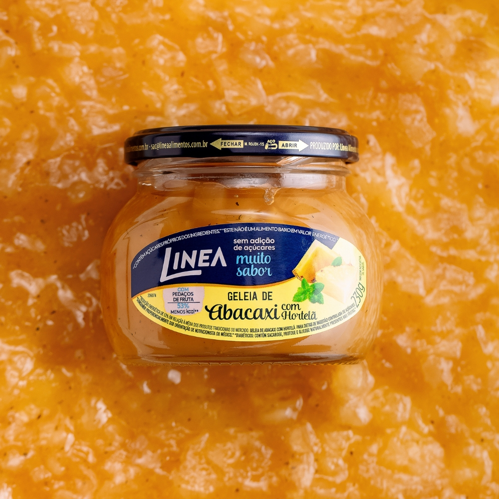Geleia de Abacaxi Linea é cremosa, sem adição de açúcar, repleta de sabor e pedaços da fruta. Com o abacaxi como 1º ingrediente, essa delícia é 56% menos calórica que geleias com açúcar. Uma explosão de doçura saudável para transformar suas refeições. INGREDIENTES: Abacaxi, purê de maçã, suco de limão, hortelã desidratado, edulcorantes: sorbitol e sucralose, estabilizante pectina, acidulante ácido cítrico, conservador sorbato de potássio, agente de firmeza fosfato tricálcico e antioxidante ácido ascórbico. NÃO CONTÉM GLÚTEN.