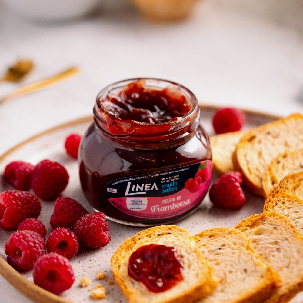 Geleia de Framboesa Linea é cremosa, sem adição de açúcar, repleta de sabor e pedaços da fruta. Com a framboesa como 1º ingrediente, essa delícia é 68% menos calórica que geleias com açúcar. Uma explosão de doçura saudável para transformar suas refeições. INGREDIENTES: Framboesa, edulcorantes: sorbitol e sucralose, estabilizante pectina, acidulante ácido cítrico, conservador sorbato de potássio, agente de firmeza fosfato tricálcico e antioxidante ácido ascórbico e corante carmim. NÃO CONTÉM GLÚTEN.