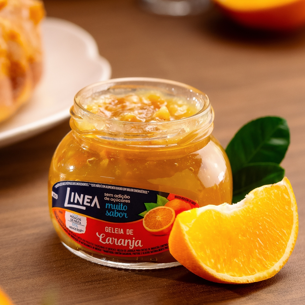 Geleia de Laranja Linea é cremosa, sem adição de açúcar, repleta de sabor e pedaços da fruta. Com o Laranja como 1º ingrediente, essa delícia é 61% menos calórica que geleias com açúcar. Uma explosão de doçura saudável para transformar suas refeições. INGREDIENTES: Laranja, Suco De Limão, Edulcorantes: Sorbitol e Sucralose, Estabilizante Pectina. Conservador Sorbato de Potássio e Agente de Firmeza Fosfato Tricálcico. NÃO CONTÉM GLÚTEN.