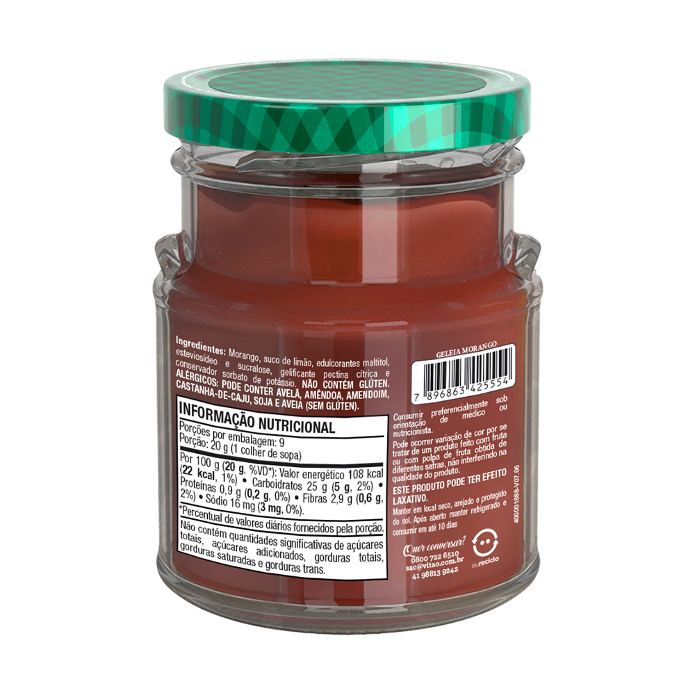 A geleia de morango sem adição de açúcares da Vitao foi especialmente desenvolvida para atender às necessidades do público que segue dietas restritivas de açúcar e glúten, assim como para aqueles que procuram manter um estilo de vida saudável com uma alimentação equilibrada, sem abrir mão do sabor. Pode ser apreciada pura, acompanhando pães, panquecas, torradas e outros alimentos, ou até mesmo utilizada como recheio em bolos, tortas e diversas sobremesas. Seu sabor delicioso e sua versatilidade a tornam uma opção perfeita para desfrutar de uma alternativa saudável e saborosa em qualquer momento. INGREDIENTES: Morango, suco de limão, edulcorantes de xarope de maltitol, glicosídeos de esteviol de Stevia rebaudiana Bertoni e sucralose, gelificante pectina cítrica e conservador sorbato de potássio. ALÉRGICOS: PODE CONTER AVELÃ, AMÊNDOA, CASTANHA-DE-CAJU, CASTANHA-DO-PARÁ, SOJA E AVEIA (SEM GLÚTEN). DIABÉTICOS: CONTÉM GLICOSE E FRUTOSE NÃO CONTÉM GLÚTEN. SEM GLÚTEN, ZERO ADIÇÃO DE AÇÚCARES.