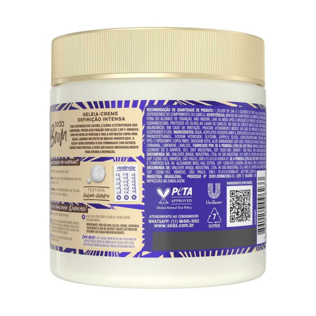 Geleia Seda Boom Creme Definição Intensa 500g A Geleia Seda Boom Creme Definição Intensa foi criada especialmente para quem deseja cachos super definidos, controlados e com movimento natural. Sua fórmula exclusiva em textura de creme e gel proporciona o equilíbrio perfeito entre fixação e hidratação, ideal para valorizar todos os tipos de curvatura. Principais Características: ✔ Fórmula com Óleo de Coco e BabosaCombinação poderosa que hidrata profundamente os fios e proporciona brilho intenso, mantendo os cachos saudáveis por mais tempo. ✔ Textura Geleia-CremeInovadora e fácil de aplicar, garante definição intensa sem deixar o cabelo rígido ou com aspecto oleoso. ✔ Controle do FrizzMantém os fios disciplinados ao longo do dia, mesmo em ambientes úmidos, oferecendo acabamento impecável. Benefícios: - Cachos definidos por mais tempo - Redução significativa do frizz - Hidratação e nutrição prolongadas - Brilho natural e toque macio - Ideal para finalização e day after Diferenciais do Produto: - Textura exclusiva que combina creme e gel - Fórmula vegana e sem parabenos - Desenvolvido especialmente para cabelos cacheados, crespos e ondulados - Fragrância marcante e agradável - Testado e aprovado por blogueiras especialistas em cabelos cacheados Especificações Técnicas: - Peso: 500g - Tipo de produto: Geleia capilar com efeito creme - Indicação: Cabelos cacheados, crespos e ondulados Instruções de Uso: - Aplique a geleia nos cabelos úmidos, mecha por mecha, distribuindo uniformemente do comprimento às pontas. - Modele com os dedos, fitagem ou técnica de sua preferência. - Pode ser usada também no day after para redefinir os cachos. Avisos e Precauções: - Uso externo. - Evite contato com os olhos. Em caso de contato, enxágue com água abundante. - Mantenha fora do alcance de crianças. - Conserve em local fresco, longe da luz direta do sol. O que está incluso? - 1 Geleia Seda Boom Creme Definição Intensa 500g ---- DÚVIDAS FREQUENTES ---- Os produtos são originais? Sim. Todos os nossos produtos são originais. Emitem nota fiscal? Sim. Emitimos nota fiscal para todos os pedidos.