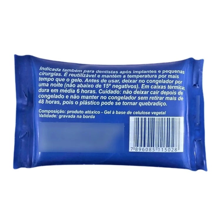 TAMANHO P - 150ML DIMENSOES: 8cmx13,5cm O Gelo Reutilizável Flexível Gelo-X da Termo gel substitui o gelo comum com vantagens: - Permanece mais tempo congelado, e reutilizável, mantem a temperatura por mais tempo que o gelo, nao molha ao descongelar e seu conteúdo e um gel atóxico. - E usado para transporte e conservação de produtos que exigem refrigeração em caixas térmicas. Embalagem Flexível em PVC. - Indispensável para o transporte de vacinas, insulina e outros medicamentos que exijam refrigeração. - Transporte de leite materno/mamadeiras (pode ser utilizado dentro da frasqueira) - Indicado também em odontologia após implantes e pequenas cirurgias. - Muito útil também em campings e pescarias, para transporte de alimentos e bebidas em caixas térmicas.