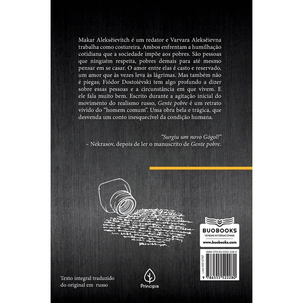 Primeira obra de Dostoiévski, Gente pobre mostra ao leitora dura realidade vivida pelos moradores de São Petesburgo, no século XIX por meio das cartas trocadas entre os protagonistas. Apesar de ter sido escrita quando o autor tinha apenas 24 anos foi sua primeira publicação, a obra já reflete a genialidade daquele que se tornou um dos grandes nomes da literatura russa. O relacionamento construído à distância, as dificuldades enfrentadas no dia a dia de uma vida paupérrima e os sentimentos mais profundos do ser humano estão claros e representados pelos personagens deste romance realista e envolvente. 15x22cm 160 Páginas