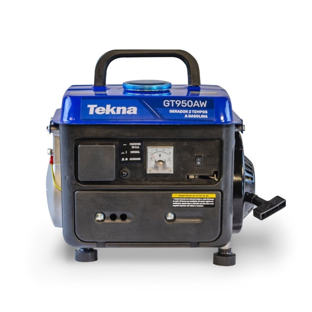 O Gerador a Gasolina Tekna GT950AW é equipado com alça que facilita o transporte, altamente prático e leve. Conta com pés de borracha que reduzem a vibração e ruído. • Econômico com baixo consumo de combustível • Com alça e pés de apoio • Carregador de Bateria incluso • Voltímetro O Gerador a Gasolina Tekna GT950AW é ideal para garantir o funcionamento dos equipamentos de mais utilidade em sua casa, no acampamento ou no sítio. Com pés de borracha que ajudam a absorver a vibração, o Gerador fica estável durante o uso. Seu motor é manual retrátil, com potência de 750 W para garantir energia sem interromper as atividades. É compacto e portátil, sua alça facilita o transporte e armazenamento. • Motor 2 Tempos • 63 Cilindradas • Potência de 750 W • Tensão de saída 127 V Peso (kg): 16 Garantia: 06 Meses Voltagem: 127V Altura (cm): 31.6 Largura (cm): 33 Comprimento (cm): 38.5 Potência Máxima: 850 Tipo de Partida: Manual Origem do Produto: Importado Potência Contínua: 700 Tipo de Combustível: Gasolina Frequência de Saída (Hz): 60 Capacidade do Tanque de Combustível (l): 4 Marca: Tekna Modelo: GT950AW - 127V Composição: Ferro Itens Inclusos: 1 Gerador e Manual de Instruções Modelo do Motor: 2 Tempos