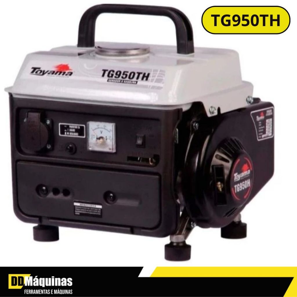 GERADOR A GASOL 110V 850W TG950TH MONO C/ CARREGADOR TOYAMA 203-001 203-001DESCRIÇÃO DO PRODUTOO Gerador de Energia a Gasolina foi desenvolvido para o uso ocasional. Possui alternador síncrono, monofásico de tensão única em 110V, 2 polos, com 850W de potência máxima, excitatriz rotativa sem escovas “Brushless”, dotado de capacitor para regulação de tensão. Conta com carregador de bateria auxiliar 12 VDC / 8 A e voltímetro analógico. Seu tanque com capacidade para 4.2 litros de combustível, proporciona uma autonomia de até 3 horas de funcionamento. Atende as demandas ocasionais, sendo indicado para diversas aplicações como: camping, pescarias, residências ou em quaisquer situações que exijam a necessidade do fornecimento de energia elétrica. É ideal para ligar lâmpadas, ventiladores, televisores, pequenas ferramentas elétricas e entre outros. ACOMPANHA:: Kit de ferramentas:: Carregador de bateria 12VDC 8A ESPECIFICAÇÕES:: Refrigeração: a ar:: Cilindros: Monocilíndrico:: Motor: 2 tempos:: Sistema de partida: Manual retrátil:: Cilindrada: 63CC:: Filtro de ar: Duplo elemento:: Capacidade do tanque: 4.2L:: Mistura gasolina e óleo mineral: 25:1:: Mistura gasolina e óleo semissintético: 50:1:: Potência máxima: 850W:: Potência nominal: 700W:: Número de fases: Monofásico:: Tensão principal: 110V:: Frequência: 60Hz:: Tomadas: 1x110V:: Nível de ruído: 62 dB:: Corrente nominal: 6.3ATERMOS DE COMPRA1 - Entrega via Shopee por transportadora.2 - Prazo de Postagem é de até 48hs, validos apenas para dias úteis após a compra.3 - O prazo de entrega informado no ato da compra é apenas um prazo estimado e não leva em consideração o prazo de postagem (item 2), podendo haver atrasos por parte da transportadora.O prazo de entrega informado é feito pela Transportadora da Shopee e não por nós. Faça o acompanhamento da sua compra para se certificar que nós postamos o seu produto no prazo informado no item 2.4 - Todas as imagens são meramente ilustrativas;5 - Caso o endereço esteja incorreto, o produto irá voltar e o pagamento será devolvido.6 - É importante que se for necessário escolher alguma variação, escolha o Tamanho/ Modelo / Cor / Voltagem imediatamente7 - Nossos produtos são originais e acompanham nota fiscalGarantia de 90 dias pelo fabricanteImagens meramente ilustrativas