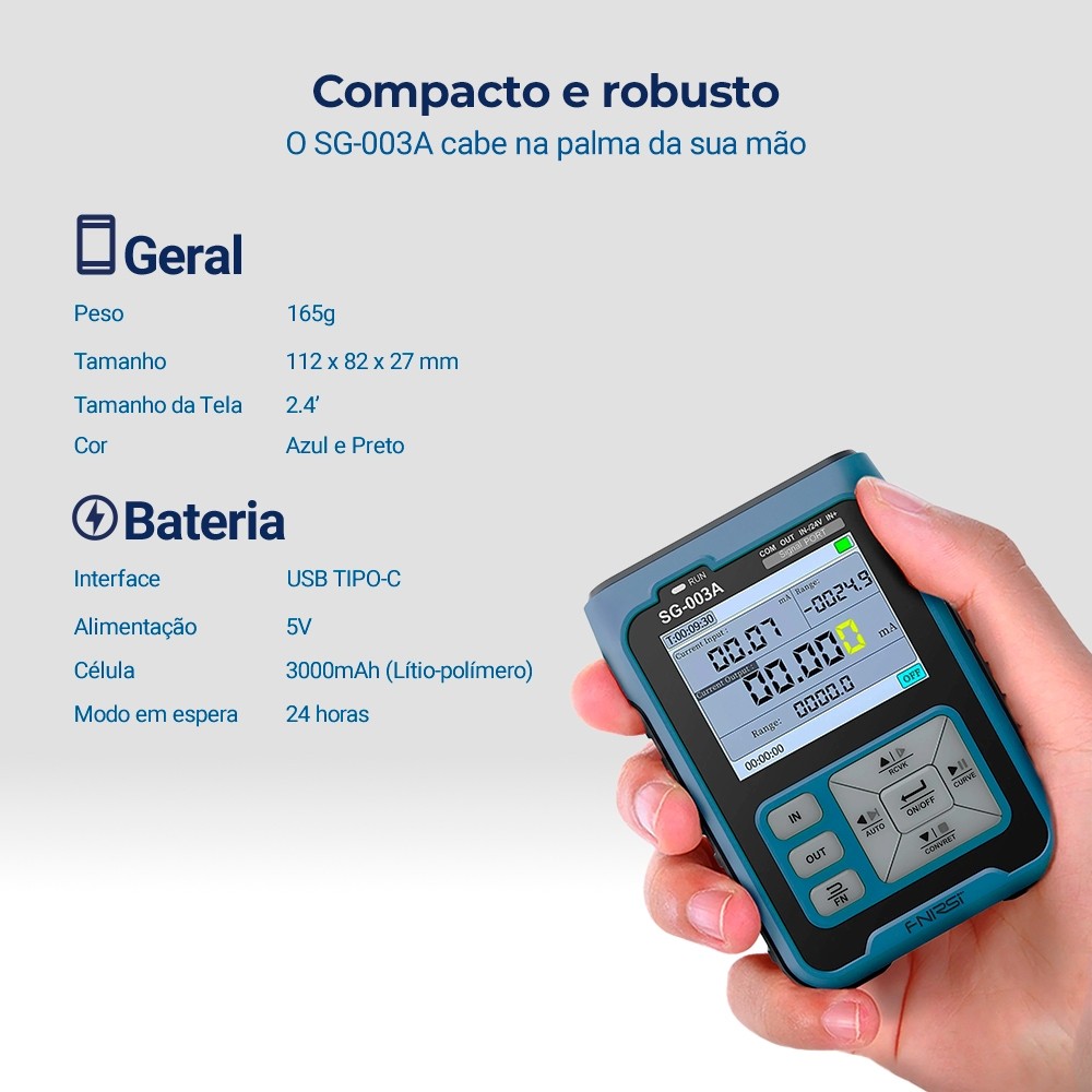 Gerador de Sinal FNIRSI SG-003A O Gerador de Sinal FNIRSI SG-003 é uma ferramenta portátil usada principalmente para a calibração de sinais em PLCs de campo industrial, instrumentação de processos e válvulas elétricas. Ele é pequeno, leve e oferece alta precisão. A luz de fundo ajustável dos botões e a tela LCD de alta definição proporcionam facilidade de uso durante o dia e a noite. Recursos e Benefícios: Design Compacto e Confortável: Formato ergonômico e leve. Funcionalidades Avançadas: Ideal para depuração de PLCs e processos industriais. Segurança e Conveniência: Luz de fundo ajustável para melhor visibilidade. O Gerador de Sinal FNIRSI SG-003 é indicado para profissionais que precisam de precisão e confiabilidade. Ficha Técnica: Frequência Máxima de Sinal: 9.999MHz; Faixa de Tensão: 30V; Faixa de Corrente: 24mA; Dimensões: 92mm (A) x 30mm (L) x 72mm (P); Peso: 165g; Garantia:6 meses de garantia contra defeitos de fabricação. Acessórios Inclusos: Manual de Instruções, cabo de teste (1 par)