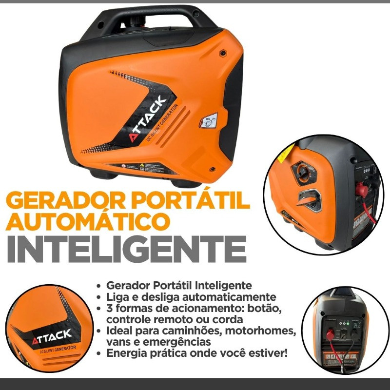 Gerador Portátil Inteligente ATTACK – Para Caminhões, Motorhomes e Vans Energia onde você estiver, com autonomia e praticidade Desenvolvido especialmente para quem vive na estrada ou precisa de energia confiável fora da rede elétrica, o Gerador ATTACK é a escolha ideal para manter suas baterias sempre carregadas com total conveniência. Por que escolher o Gerador ATTACK? Função automática inteligente Detecta quando a bateria está descarregada, liga automaticamente e desliga assim que a carga é concluída — tudo sem intervenção manual. Três formas práticas de ligar Controle remoto Botão de acionamento no painel Corda de partida manual Versátil para diversas aplicações Ideal para caminhoneiros, viajantes em motorhomes, vans, campistas e para quem precisa de uma fonte de energia de reserva em emergências. Especificações Técnicas Potência nominal: 1600W Potência máxima: 1800W Corrente de carga: até 80A/h Tensão de saída: 12V ou 24V (escolher no momento da compra) Motor: 4 tempos, 80cc, a gasolina Consumo: Apenas 800 ml/h Nível de ruído: 65 dB a 3 metros Tanque: 3,4L Peso: 18 kg Dimensões: Produto: 48 × 28,5 × 46 cm Embalagem: 55 × 34 × 52 cm Acessórios Inclusos Chicote elétrico de 2 metros (espessura 7mm) Controle remoto Botão de partida e corda de acionamento Funil, ferramentas e manual de instruções Vela de motor reserva Mais mobilidade, segurança e energia sem preocupações. Ideal para quem busca conforto e autonomia em qualquer cenário. Observações importantes: Disponível nas versões 12V ou 24V — selecione a voltagem desejada no momento da compra. É necessário adicionar óleo 15W50 antes do primeiro uso. O funcionamento do motor sem óleo pode causar danos permanentes.