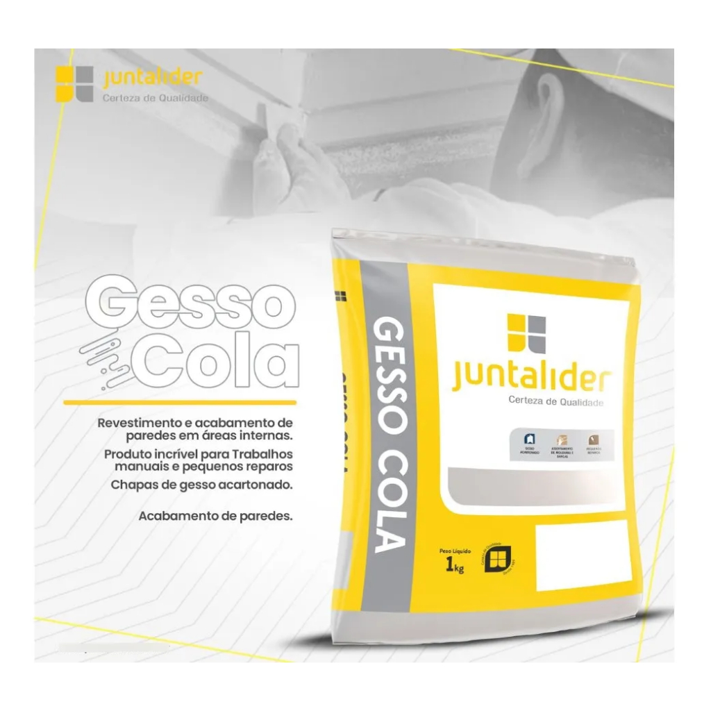 GESSO COLA 1 KG EM PÓ BRANCO JUNTALIDER Indicado para: Pequenos reparos em geral Assentamento de molduras Aplicação em alvenarias em geral: Paredes, tetos, vigas, pilares e emboços em aéreas internas Uso interno Chapas de gesso acartonado Placa de gesso para forros ########## LOJA TÁ FÁCIL COMPRAR ########## Olá querido comprador(a), venho aqui através desta, informar que, todos os pedidos recebidos são postos em ordem de chegada e são separados e embalados o mais rápido possível! Gostaria também de, notificá-los que, nossa loja, trabalha de seg à sex das 08:00 às 18:00, sendo assim, os pedidos realizado nas Sextas-Feiras depois das 18:00h só serão postos em ordem de chegada no próximo dia útil ( Segunda-Feira ) às 08:00! Então não se preocupe com a parte da nossa logística, tá bom? Seu pedido será entregue dentro do prazo previsto pelo sistema da Shopee! Importante ressaltar também que, a transportadora que realiza a coleta dos pedidos é a Shopee Xpress, sendo assim, qualquer dúvida sobre entrega ou quaisquer outro assunto de frete, endereço, tudo deverá ser tratado diretamente com a Shopee através do Chat Suporte disponível no site! Desde já agradeço a compreensão de todos!