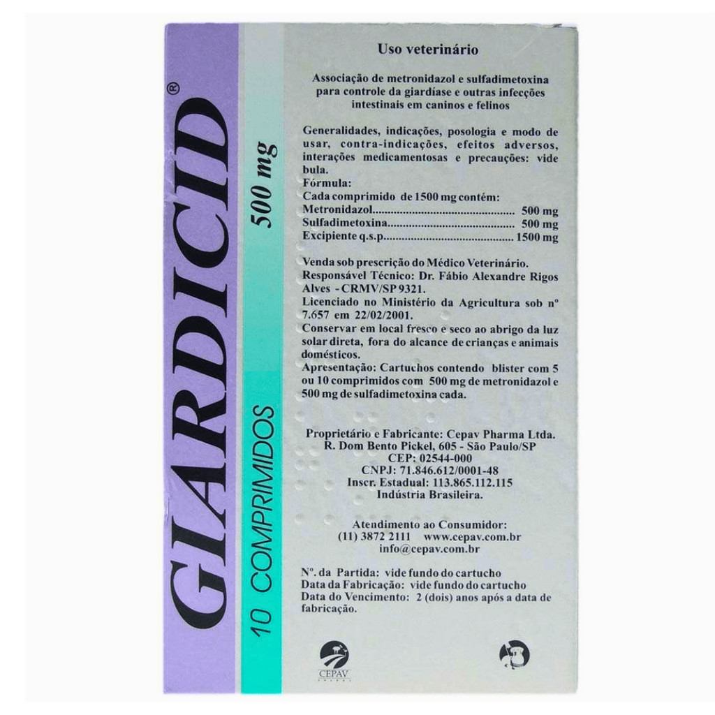 *ATENÇÃO* Produto em Campanha devido Validade Maio.2026 - Comprimidos anti-parasitários, eficaz contra Giardia spp - Combinação de metronidazol e sulfadimetoxina para amplo espectro - Indicado para cães e gatos em todas as etapas de vida - Tratamento de diarreia aguda e crônica causada por protozoários - Ajuda a evitar a transmissão da infecção entre animais e humanos - Não contém glúten A Giardia spp. é um protozoário encontrado no trato intestinal de humanos e na grande maioria dos animais domésticos ao redor do mundo. Várias pesquisas realizadas em populações caninas revelam uma prevalência de aproximadamente 10% em cães bem tratados, 36 a 50% em filhotes e até 100% de incidência em animais de canil. A prevalência em gatos é de 1,4% a 11%. Apesar da incidência em cães e gatos ser bastante elevada, nem todos os animais apresentam sintomas da doença, podendo entretanto transmitir a infecção para outros animais e também para o homem. A diarréia aguda, intermitente ou crônica é o principal sintoma associado à infecção por Giardia spp. O metronidazol, além de sua atividade antiprotozoário, atua como antibacteriano, atacando bactérias que têm como característica comum o fato de serem anaeróbias e possuírem proteínas para o transporte de elétrons com um potencial de oxi-redução limitado. Essas proteínas reduzem o radical nitro do metronidazol por uma reação química não enzimática, induzindo uma redução na concentração intracelular do fármaco não modificado o que favorece a captação e a geração de agentes tóxicos para a célula. O efeito antibacteriano depende, portanto, de compostos metabólicos intermediários e instáveis e de radicais livres transitórios que se conjugam com o DNA e inibem sua síntese, induzindo a morte celular. Em protozoários o mecanismo exato de ação é desconhecido, porém sugere-se que há um efeito citopático na Entamoeba histolityca relacionado com a hialinização do citoplasma, com a formação de figuras esferoidais e com a ruptura da membrana celular. O mecanismo de ação da sulfadimetoxina é o mesmo das sulfonamidas, ou seja, por bloqueio do ácido para-aminobenzóico (PABA) e do ácido fólico, impedindo o desenvolvimento do esquizonte. A associação do metronidazol com a sulfadimetoxina se justifica pela ampliação do espectro de ação, já que, enquanto o metronidazol atua preferencialmente contra Giardia spp., a sulfadimetoxina age contra outros protozoários e bactérias patogênicas do trato gastrintestinal. Como em muitos casos existem infecções simultâneas por diferentes agentes etiológicos sensíveis à formulação metronidazol / sulfadimetoxina e sendo a sintomatologia clínica semelhante, a associação das duas substâncias representa um valioso instrumento terapêutico para o clínico.