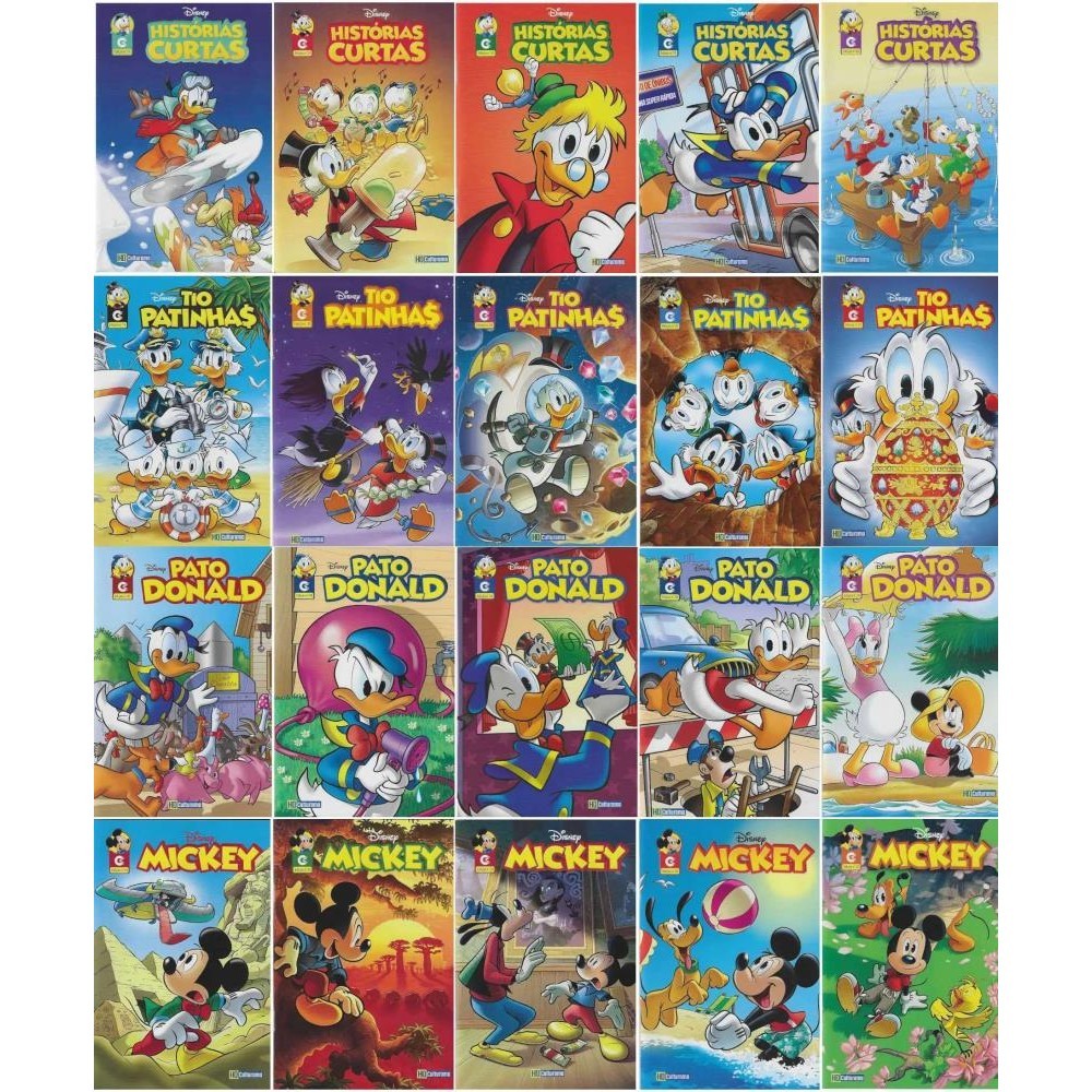 São 40 revistas enviadas de forma aleatória, sem repetição de capas. O kit contém revistas dos seguintes títulos: Pato Donald Pateta Mickey Tio Patinhas Aventuras Disney Histórias Curtas Disney Imagens ilustrativas, as revistas enviadas não serão necessariamente as revistas das imagens do anúncio. As revistas são da Editora Culturama, referência em qualidade, que se confirma até na qualidade do papel do gibi, que é branco e superior. Formato 13 x 20cm, encadernação lombada com grampo, cada revista com 66 páginas.