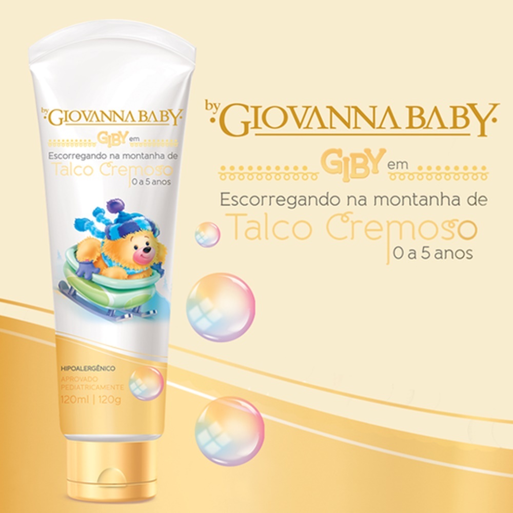 Talco Cremoso Giby de Giovanna Baby O Talco cremoso Giby Giovanna Baby foi especialmente desenvolvido para a pele delicada do seu bebê. Possui o exclusivo ativo “Giby Care”: Uma fórmula cuidadosamente enriquecida com extrato de coco, que promove hidratação natural; extrato de algodão, com propriedades emolientes, e “mel vegetal”, com propriedades nutritivas. Sua fórmula é rapidamente absorvida, deixando uma camada fina de talco, proporcionando bem estar ao seu bebê. Sem parabenos Fragrância Giovanna baby Aprovado por Pediatras Hidrata a pele do bebê formando uma fina camada de talco. Proporciona uma pele lisinha e aveludada. Formulado de maneira a minimizar surgimento de alergias Dica: O Talco Cremoso não pode ser utilizado como creme preventivo de assaduras