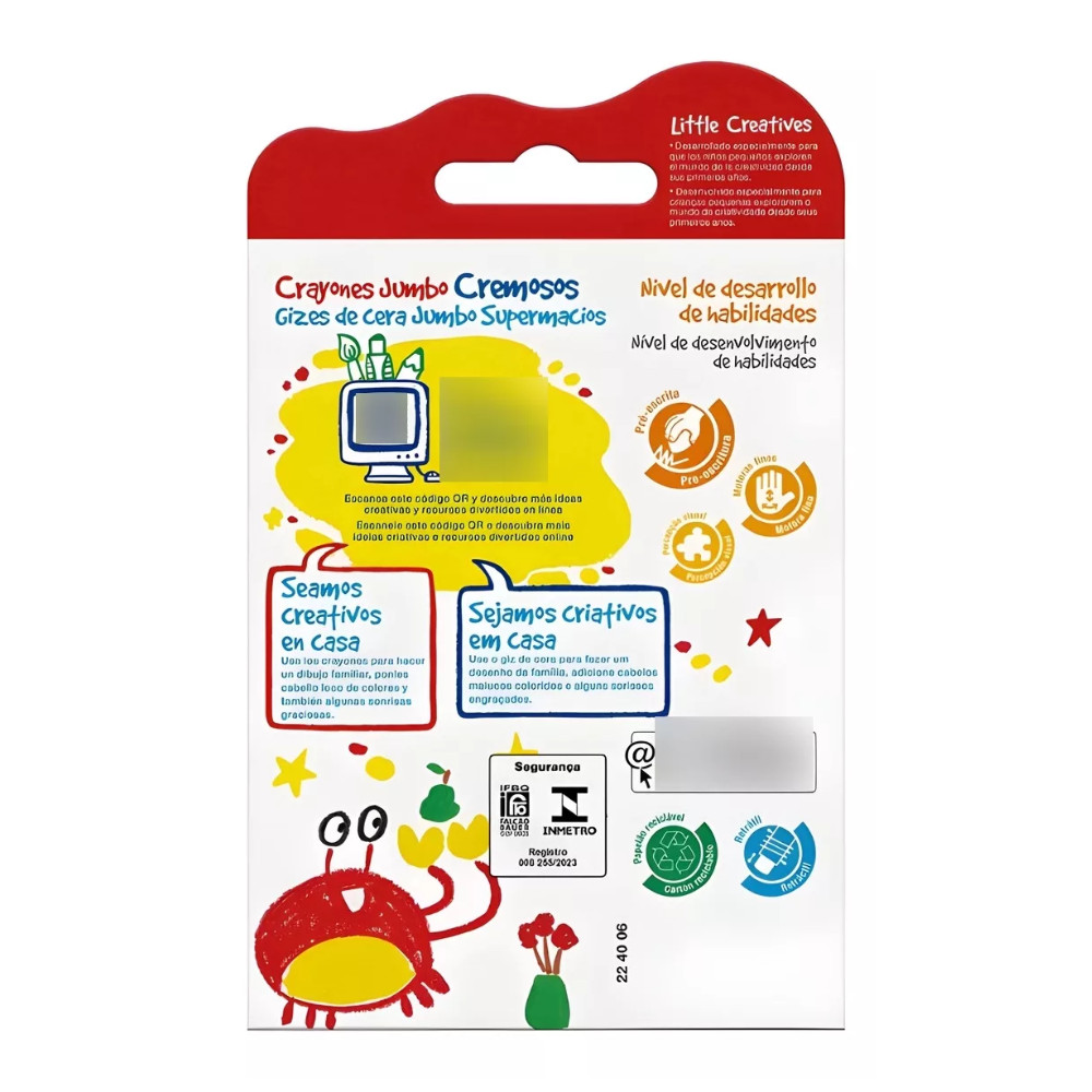 O Giz de Cera Jumbo Supermacio 6 Cores Faber Castell é ideal para crianças em fase de aprendizado e desenvolvimento da coordenação motora. Com formato grosso e fácil de segurar, proporciona traços macios e cores intensas, sendo perfeito para atividades escolares e momentos criativos em casa. Características Marca: Faber Castell Quantidade: 6 cores Modelo: Jumbo supermacio Formato grosso ideal para mãos pequenas Lavável das mãos Sistema retrátil Cores vivas e ótima cobertura Indicado para educação infantil Produto original Modos de cuidado Manter em local seco e arejado Evitar exposição ao calor excessivo Após o uso, recolher o giz para proteger a ponta Utilizar sob supervisão de um adulto Como usar Girar a base para expor o giz Aplicar sobre papel para desenhar e colorir Ideal para atividades escolares, desenhos e trabalhos criativos Recolher após o uso para maior durabilidade O que acompanha 1 Estojo com 6 Gizes de Cera Jumbo Supermacios Faber Castell