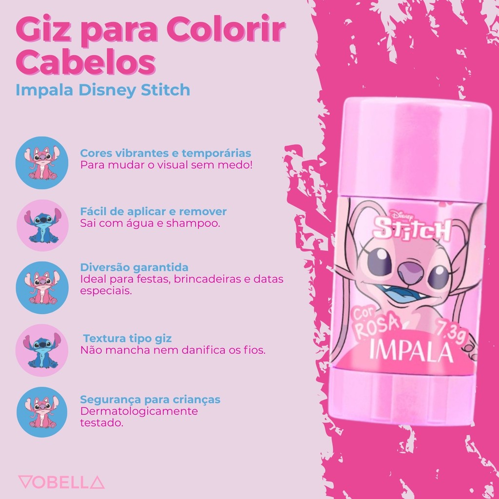 O Giz Para Colorir Cabelos Angel Kids Stitch Disney Impala foi desenvolvido especialmente para quem adora mudar o visual de forma temporária, segura e prática! Garante um toque de cor vibrante, sem danificar os fios. Ideal para festas, brincadeiras, datas comemorativas ou apenas para expressar a criatividade no dia a dia. Sobre o produto: -Giz para Colorir Cabelos Angel. -Marca: Impala. -Linha: Disney Stitch. -Cor: Rosa. -Efeito temporário. -Fácil aplicação e remoção. -Não danifica os fios. -Ajuda na regeneração das unhas. -Ideal para todos os tipos de cabelo. -Visual criativo e divertido. -Embalagem prática e temática. Indicado para: -Crianças acompanhadas por um adulto. -Adultos que buscam coloração temporária. -Festas, brincadeiras e uso criativo no dia a dia. Modo de uso: -Com os cabelos secos, aplique o giz diretamente nos fios, pressionando levemente. -Passe o giz mecha por mecha até obter o tom desejado. -Se quiser, finalize com spray fixador para maior durabilidade. -Para remover, lave normalmente com shampoo. Precauções: -Uso externo. -Produto não comestível. -Manter fora do alcance de crianças sem supervisão. -Em caso de irritação, suspenda o uso e procure orientação médica. -Não aplicar em couro cabeludo lesionado. Com fórmula prática, efeito temporário e visual criativo, o Giz para Colorir Cabelos Impala Disney Stitch Angel é a escolha perfeita para quem quer se divertir com estilo e segurança. Adquira já o seu e transforme seu look em minutos! Em caso de dúvidas, entre em contato com a gente. Boas compras!