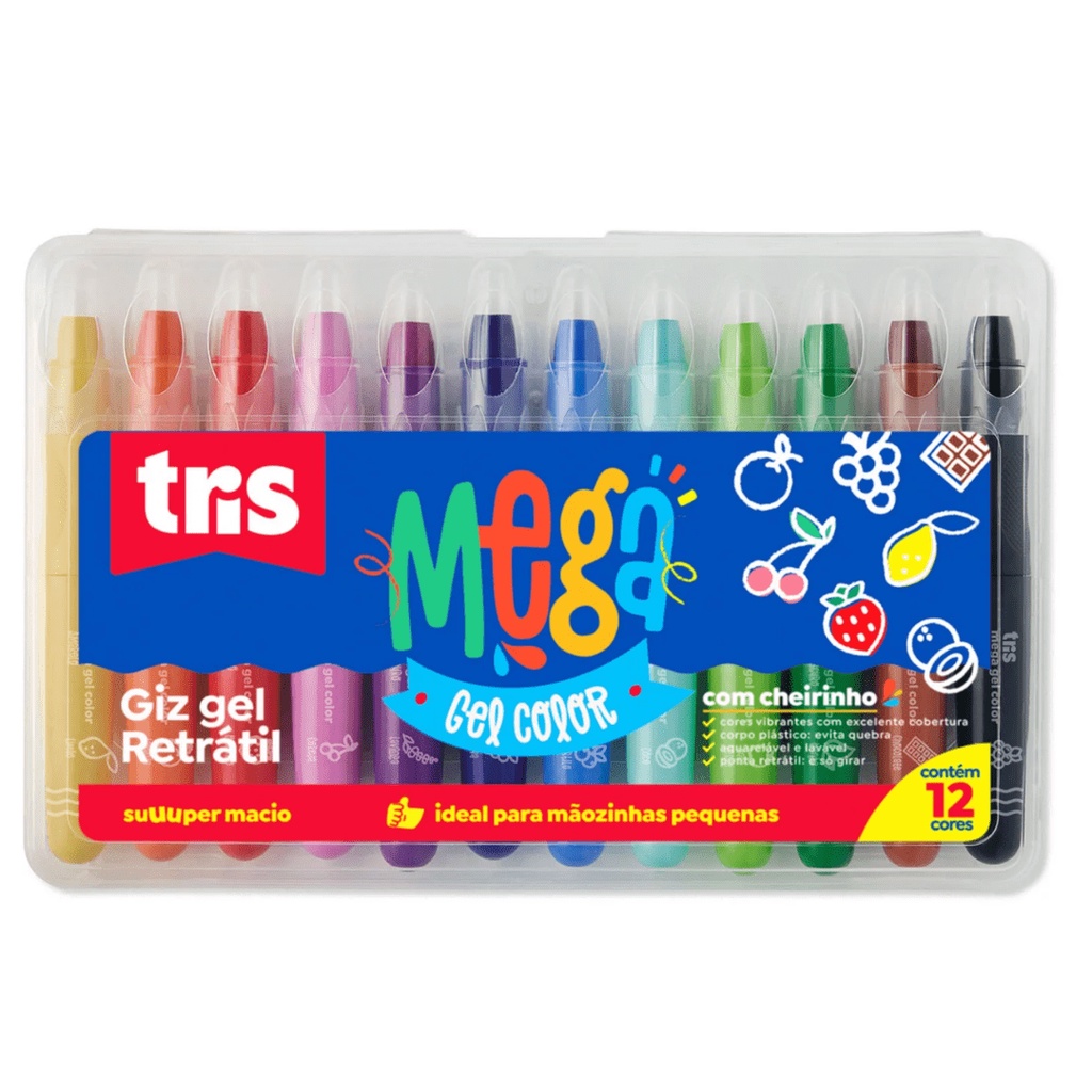 //Giz Retrátil em Gel com Cheirinho – Tris Mega Gel Color | Estojo com 12 Cores// Deixe a criatividade fluir com o Tris Mega Gel Color! Um giz retrátil em gel com cheirinho de frutas, que encanta crianças, pais e professores. Ideal para a pré-escola, ele oferece uma experiência colorida, divertida e de alta qualidade. Por que escolher o Tris Mega Gel Color? 🍓 Aroma suave de frutas que torna o momento de desenhar ainda mais divertido 🎨 Cores super vibrantes com excelente cobertura ✍️ Traço super macio e metalizado, ideal para mãos pequenas 💧 Aquarelável – mais possibilidades criativas ✅ Retrátil e com corpo plástico rígido, que evita sujeira, não quebra fácil e mantém o estojo limpo 🧒 Formato ergonômico, que facilita a pegada e o controle 💼 Estojo com 12 cores – prático e resistente O Tris Mega Gel Color é o companheiro perfeito para os primeiros passos no mundo da arte, com a qualidade e segurança que só a Tris oferece!