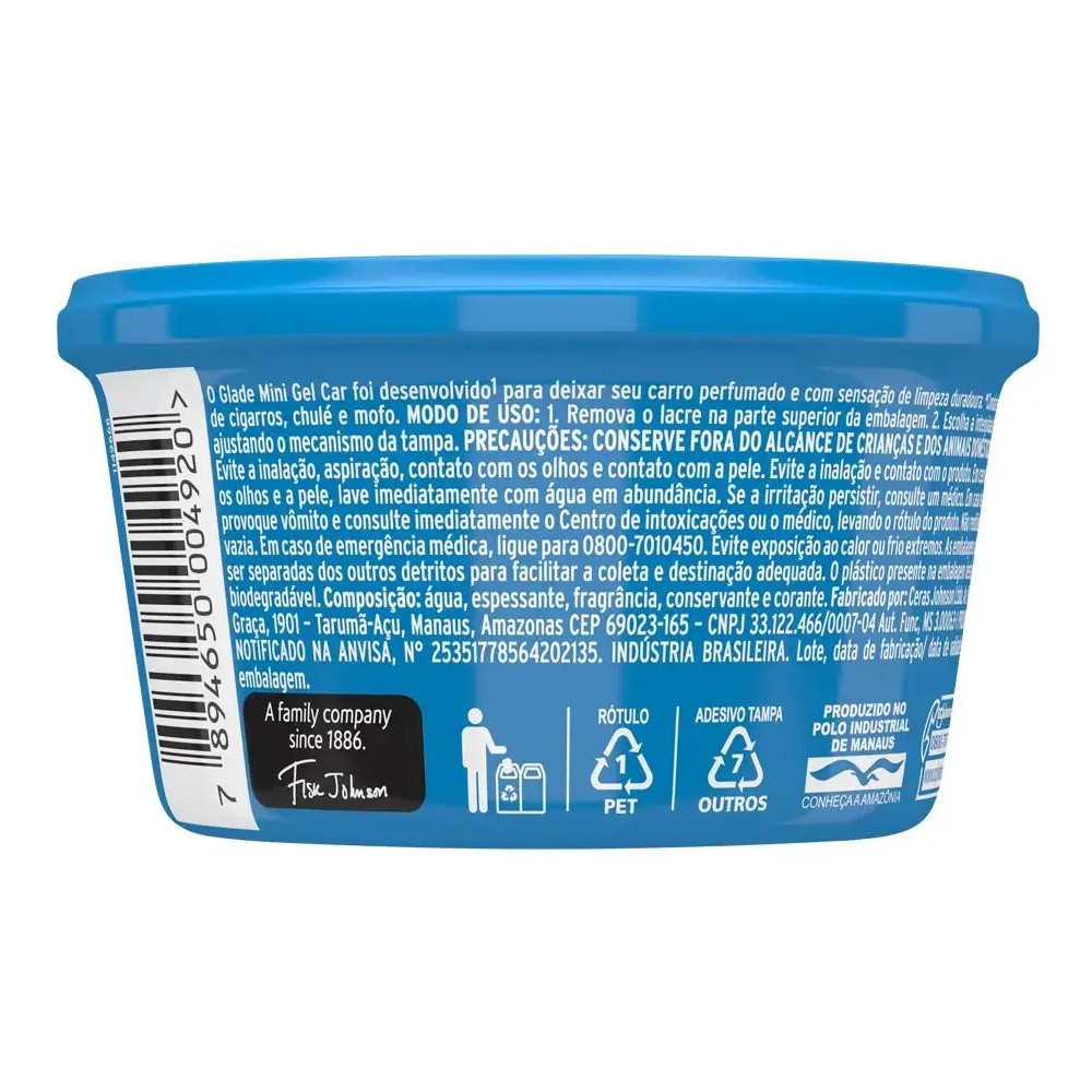 Glade® Car Acqua Torne sua viagem mais agradável, eliminando maus odores e proporcionando semanas de perfume, de forma discreta e econômica, com Glade® Car Acqua. A tampa plástica permite liberar a fragrância revigorante de fruta fresca e jasmim, oferecendo perfume duradouro de forma econômica. Benefícios: Glade® Car é a melhor maneira de tornar a sua viagem mais agradável, eliminando maus odores e proporcionando semanas de perfume, de forma discreta e econômica. A tampa plástica permite liberar a fragrância, oferecendo perfume duradouro de forma econômica. Instruções de uso: Retire a tampa plástica. Retire o lacre de alumínio cuidadosamente. Coloque a tampa plástica novamente. Escolha a intensidade da fragrância ajustando o mecanismo da tampa.