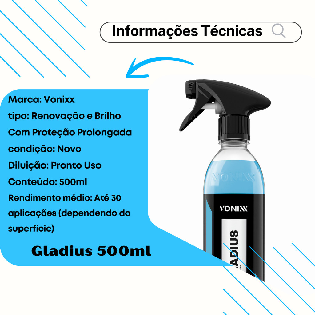 🚗 Gladius 500ml – Renovação e Brilho com Proteção Prolongada 🔹 Os coatings cerâmicos sofrem degradação com o tempo e podem ser danificados por produtos químicos indesejáveis, fazendo com que percam proteção, brilho e hidrorrepelência. 🔹 O Gladius é um reconstrutor cerâmico desenvolvido para restaurar a proteção, o brilho e a hidrorrepelência de superfícies vitrificadas. 🔹 Pode ser aplicado sempre que houver perda de brilho e repelência à água na pintura. 📌 Referências Compatíveis 35336 2050440 ℹ Informações do Produto Marca: Vonixx Tipo: Renovação e Brilho com Proteção Prolongada Condição: Novo Diluição: Pronto Uso Conteúdo: 500ml Rendimento Médio: Até 30 aplicações (dependendo da superfície) Garantia: 90 dias 🛠 Aplicações Recupera a proteção, o brilho e a hidrorrepelência em superfícies com coating cerâmico. Indicado para veículos que apresentem perda de brilho ou de repelência à água. ✨ Benefícios 🔹 Renovação do aspecto original com brilho acetinado e uniforme. 🔹 Reforço da proteção UV, prevenindo desbotamento, rachaduras e ressecamento. 🔹 Efeito hidrorepelente, protegendo contra umidade e sujeira. 🔹 Toque seco, ideal para uso interno e externo. 🔹 Durabilidade prolongada, reduzindo a frequência de reaplicações. 🔹 Não engordura e não deixa resíduos pegajosos ou manchas. 🔹 Fácil aplicação com aplicador de espuma ou pano de microfibra. 📋 Modo de Usar Agite bem o produto antes de usar. Após lavar e secar o veículo, pulverize em uma área de até 60cm x 60cm. Espalhe com uma microfibra. Finalize com outra toalha de microfibra até obter o brilho desejado. Repita o processo até concluir toda a superfície. 🛒 Onde Comprar Adquira o Gladius 500ml em nossas lojas oficiais: Camillo Parts, Genuine Automotive ou Edumac Parts – qualidade garantida e suporte especializado.