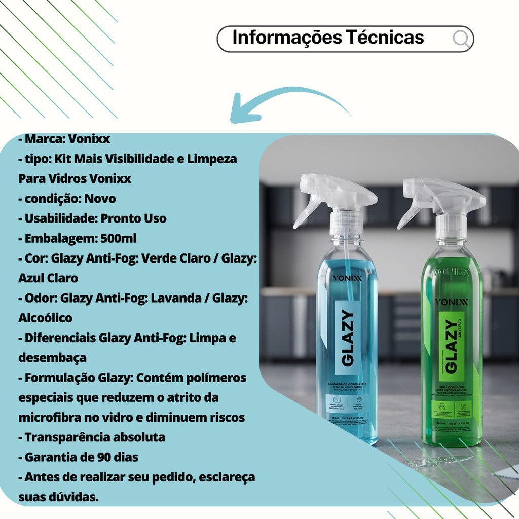 👋 Bem-vindo!! Você está em uma loja especializada em soluções automotivas seguras e confiáveis. Aqui, cada detalhe é pensado para cuidar do que move você: sua família, sua segurança e seus melhores momentos na estrada. 🚗✨ 👀 Kit Mais Visibilidade e Limpeza Para Vidros Vonixx No kit estão inclusos: 🧴 1x Glazy Anti-Fog Vonixx Tecnologia antiembaçante com fórmula inteligente para manter vidros internos sempre transparentes. 🧴 1x Glazy 500ml Vonixx Limpador de vidros 4 em 1 que limpa, protege, condiciona e reduz riscos. Este kit foi desenvolvido para proporcionar máxima visibilidade, limpeza profunda e proteção dos vidros, garantindo segurança ao dirigir e acabamento profissional. ✨ 🔎 Referências Compatíveis 📌 37279 + 35337 📌 1040014 📌 2050439 📋 Informações do Produto 🏷 Marca: Vonixx 📦 Tipo: Kit Mais Visibilidade e Limpeza Para Vidros ✨ Condição: Novo 💧 Usabilidade: Pronto uso 📦 Embalagem: 500ml cada 🎨 Cor: • Glazy Anti-Fog: Verde claro • Glazy: Azul claro 🌿 Odor: • Glazy Anti-Fog: Lavanda • Glazy: Alcoólico ⭐ Diferenciais: ✔ Glazy Anti-Fog limpa e desembaça ✔ Glazy possui polímeros especiais que reduzem o atrito da microfibra no vidro ✔ Transparência absoluta nos vidros 🛡 Garantia: 90 dias ⚠ Antes de realizar seu pedido, esclareça suas dúvidas. 🔧 Aplicações do Kit Pode ser utilizado em diversas superfícies de vidro: 🚗 No veículo ✔ Para-brisa ✔ Vidros laterais ✔ Vidro traseiro 🪞 Outras aplicações ✔ Espelhos de vidro ✔ Viseiras de capacetes ✔ Óculos de proteção ✔ Superfícies de vidro em geral ⭐ Benefícios do Kit ✔ Evita o embaçamento dos vidros ✔ Melhora a visibilidade durante chuva ou frio ✔ Aumenta a segurança ao dirigir ✔ Forma película protetora antiembaçante ✔ Limpeza eficiente com transparência total ✔ Fácil aplicação ✔ Secagem rápida ✔ Ideal para uso automotivo e doméstico ✔ Redução de micro riscos causados por limpadores de para-brisa ou flanelas ✔ Acabamento com toque liso, brilho e aparência de vidro renovado 🧽 Modo de Usar 🧴 Glazy Anti-Fog 1️⃣ Pulverize diretamente no vidro interno 2️⃣ Espalhe com microfibra limpa e seca 3️⃣ Aguarde 20 a 30 segundos para o produto agir 4️⃣ Finalize com outra microfibra seca para acabamento perfeito 🧴 Glazy 4 em 1 1️⃣ Pulverize pequena quantidade diretamente no vidro 2️⃣ Espalhe rapidamente com microfibra específica para vidros 3️⃣ Vire a microfibra ou utilize outra limpa para acabamento final 4️⃣ Se necessário, repita a aplicação 🛒 Adquira agora o Kit Mais Visibilidade e Limpeza Para Vidros Vonixx em uma de nossas Lojas Oficiais: 🏪 Camillo Parts 🏪 Genuine Automotive 🏪 Edumac Parts Assim você tem a certeza de adquirir um produto de alta qualidade, com garantia e suporte que você merece. ✅ ⚖ Aviso Legal Proibimos o uso, cópia ou alteração de nossas fotos, imagens e conteúdo presentes nos anúncios. Conforme a Lei 9.610/98, qualquer violação será tratada legalmente, pois possuímos direitos autorais sobre este material. 📄⚖️