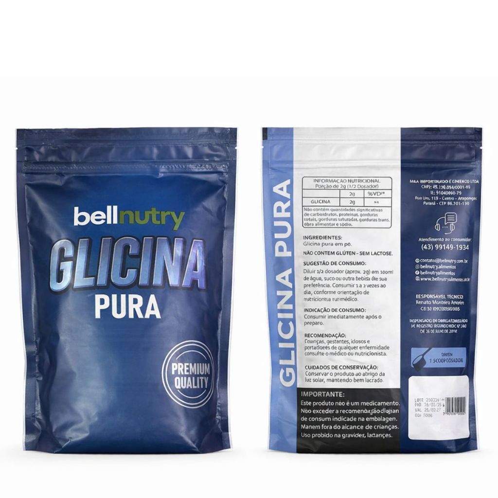 Glicina Pura Bellnutry Alimentos A Glicina Pura Bellnutry é um aminoácido não essencial de alta pureza, livre de glúten, lactose e aditivos artificiais. Reconhecida por sua versatilidade, ela desempenha um papel essencial em funções como qualidade do sono, recuperação muscular, síntese de colágeno e saúde metabólica. Com 100% de concentração e qualidade premium, é a escolha ideal para atletas, praticantes de atividades físicas e pessoas que buscam mais disposição, bem-estar e longevidade. Principais Benefícios *Melhora a qualidade do sono – auxilia no relaxamento e contribui para um descanso mais profundo e reparador. *Recuperação muscular – participa da síntese de proteínas, favorecendo a reconstrução muscular após treinos intensos. *Saúde da pele, unhas e articulações – fundamental para a produção de colágeno, que mantém tecidos firmes e resistentes. *Ação antioxidante e detoxificante – contribui para a síntese de glutationa, potente antioxidante natural que protege células e fígado. *Controle metabólico – pode apoiar a sensibilidade à insulina e auxiliar no equilíbrio da glicemia. *100% natural e vegano – livre de glúten, lactose e aditivos. Diferenciais Bellnutry Produto 100% puro e concentrado Vegano e natural Sem glúten e lactose Embalagem prática e com vedação zip lock Marca com rigoroso padrão de qualidade Modo de Consumo Recomenda-se ingerir de 3g ao dia, diluída em água ou bebida de preferência, antes de dormir ou após o treino. * Uso conforme orientação de nutricionista ou médico. Perguntas Frequentes 1. A Glicina engorda? Não. A glicina é um aminoácido sem calorias significativas e pode até ajudar na composição corporal. 2. Quem pode usar? Homens e mulheres, atletas ou não, que buscam melhora do sono, recuperação muscular, saúde da pele e articulações. 3. Posso tomar todos os dias? Sim. É um suplemento seguro, desde que consumido dentro da dosagem recomendada. Conteúdo da Embalagem Embalagem com fechamento zip lock para melhor conservação Bellnutry – Qualidade que você confia A Bellnutry é uma marca especializada em nutrição e bem-estar, oferecendo produtos de alta pureza, sem aditivos desnecessários e com rigoroso controle de qualidade. Invista na sua saúde e performance com a Glicina Pura Bellnutry.