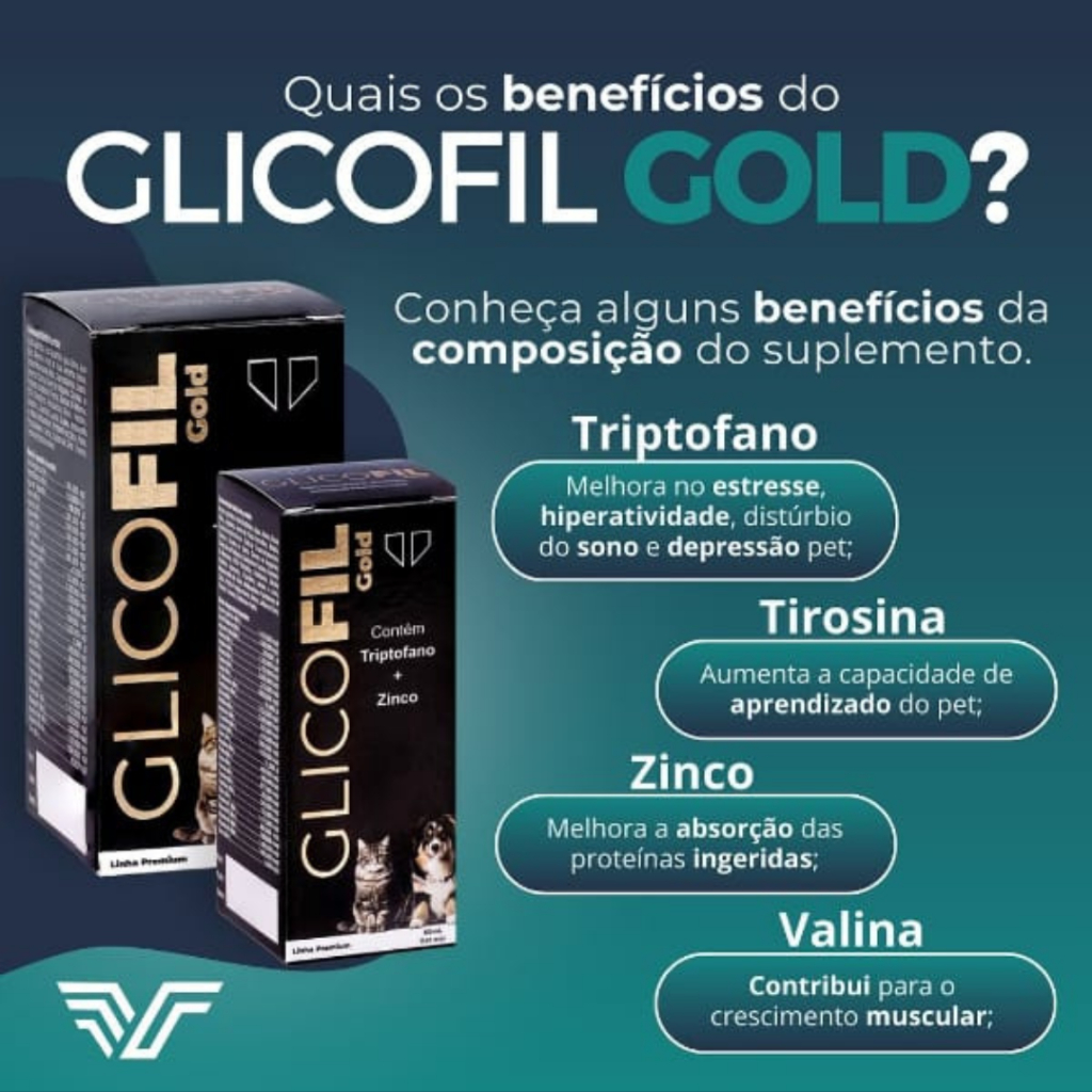 GLICOFIL GOLD — Filvet O melhor custo-benefício em suplementação para cães e gatos. Suplemento vitamínico, mineral e de aminoácidos desenvolvido para aumentar energia, melhorar comportamento e potencializar a recuperação e o desempenho do seu pet. Indicado para filhotes em crescimento, animais idosos, em recuperação, e para suporte em períodos de estresse ou preparo para competições/exposições. Por que escolher Glicofil Gold? • Fórmula completa de aminoácidos e minerais (contém triptofano, tirosina, valina e zinco) que atuam de forma complementar para equilibrar comportamento, aprendizado, crescimento e absorção nutricional. • Melhor custo-benefício: fórmula concentrada e ampla tabela nutricional — entrega resultados reais sem pesar no bolso. (Disponível em frascos e apresentações comerciais em vários pontos de venda). Benefícios comprovados (resumido) • Triptofano — auxilia na redução do estresse, hiperatividade e melhora padrões de sono; útil em casos de ansiedade e depressão pet. • Tirosina — favorece capacidade de aprendizado e foco, importante para adestramento e melhor resposta a estímulos. • Valina — aminoácido essencial que contribui para o crescimento e manutenção da massa muscular. • Zinco — otimiza a absorção de proteínas e participa de múltiplas funções vitais (veja 5 benefícios abaixo). 5 benefícios do Zinco no Glicofil Gold 1. Suporte ao sistema imunológico — fortalece as defesas naturais do pet. 2. Acelera cicatrização de feridas — importante em pós-operatório e pequenos acidentes. 3. Saúde da pele e pelagem — combate queda e proporciona pelagem mais brilhante e saudável. 4. Função cognitiva saudável — participa de processos enzimáticos ligados ao cérebro e comportamento. 5. Digestão adequada — melhora aproveitamento das proteínas e nutrientes da dieta. Indicações rápidas • Uso oral: direto na boca, misturado em ração ou água. Indicado para cães e gatos de todas as idades quando for necessária suplementação vitamínica, mineral e de aminoácidos. Ideal para animais em recuperação, em treinamento, gestantes/lactantes e idosos. (Consulte bula e orientação veterinária para dosagem específica).