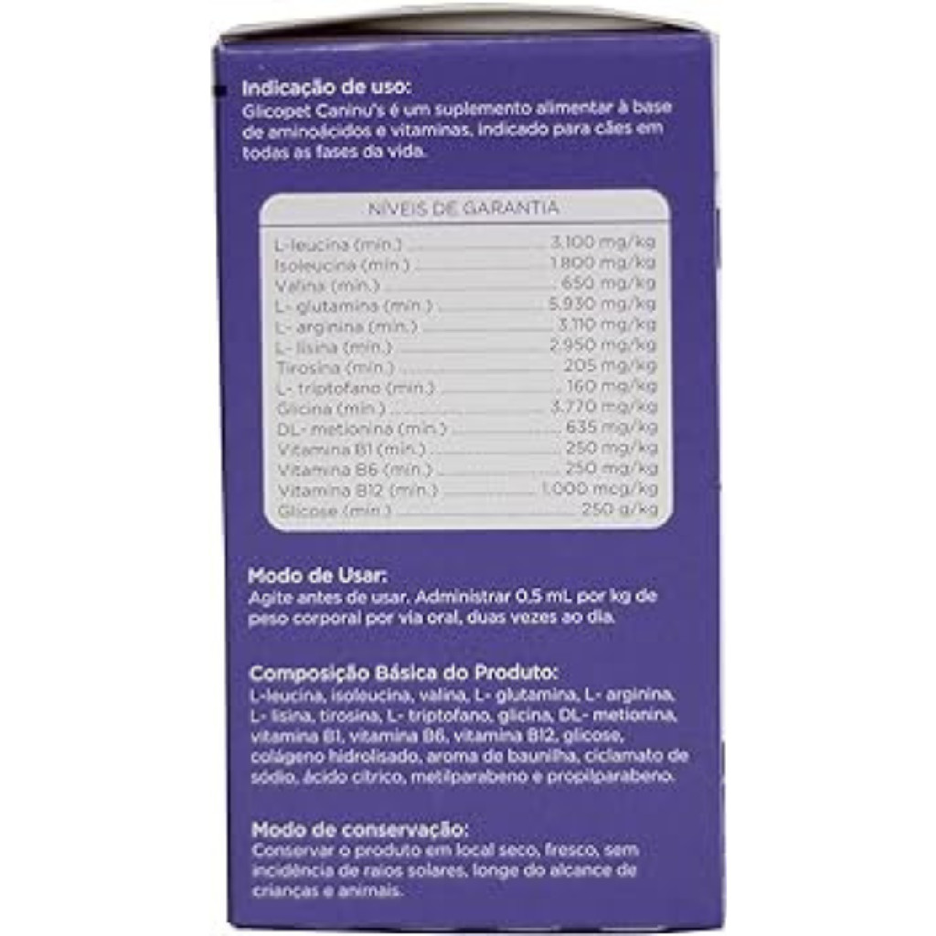 Glicopet Caninus 30ml Suplemento Vitamínico para Cães! - Com Seringa Dosadora O Glicopet Caninus 30ml é um suplemento vitamínico líquido especialmente desenvolvido para cães, com a finalidade de suplementar nutrientes essenciais que contribuem para a saúde geral e o bem-estar do seu pet. Com uma fórmula rica em vitaminas, minerais e gliconutrientes, o Glicopet Caninus é ideal para cães de todas as idades que necessitam de reforço vitamínico, especialmente em situações de recuperação, estresse físico ou quando há necessidade de suplementação nutricional adicional. Este suplemento é formulado para promover a saúde articular, energia, vitalidade e o equilíbrio metabólico do seu cão. Sua forma líquida facilita a administração, permitindo uma absorção mais rápida dos nutrientes e tornando o uso diário mais prático. Principais Benefícios:Apoio à saúde articular e muscular: O Glicopet Caninus contém gliconutrientes que auxiliam na proteção das articulações, redução de inflamações e na manutenção da mobilidade dos cães, sendo especialmente útil para cães mais velhos ou que praticam atividades físicas intensas. Fortalecimento do sistema imunológico: Com vitaminas essenciais, como vitamina C e vitamina E, o suplemento contribui para o fortalecimento do sistema imunológico, ajudando seu cão a se manter saudável e resistente a doenças. Aumento da energia e vitalidade: A presença de vitaminas do complexo B contribui para o aumento da energia e melhora do apetite, sendo indicado para cães que necessitam de mais disposição ou que estão se recuperando de doenças ou tratamentos. Fácil administração e absorção: Apresentado em formato líquido, o Glicopet Caninus 30ml é fácil de administrar, podendo ser misturado à ração ou administrado diretamente na boca do seu pet. A absorção é rápida e eficaz, garantindo que seu cão receba os benefícios do suplemento de maneira otimizada. Suplementação equilibrada para cães de todas as idades: Ideal para filhotes, adultos e idosos, o suplemento ajuda a manter o equilíbrio nutricional, suportando o crescimento saudável e o bem-estar contínuo do seu cão. Indicações:Para cães em recuperação de doenças, cirurgias ou tratamentos médicos.Cães idosos que necessitam de suporte articular e energético.Cães ativos ou de trabalho que precisam de suplementação adicional de energia e nutrientes.Ideal para cães com dificuldades alimentares, falta de apetite ou que precisam de um reforço vitamínico na dieta.Modo de Uso:A dosagem recomendada deve ser ajustada de acordo com o porte e as necessidades do seu pet. O suplemento pode ser administrado diretamente na boca ou misturado à ração ou água. Cães pequenos (até 5 kg): 1 ml por dia.Cães de porte médio (5 a 15 kg): 2 ml por dia.Cães grandes (acima de 15 kg): 3 ml por dia.A dose pode ser ajustada conforme orientação veterinária, de acordo com a condição e a necessidade específica do seu cão. Composição:O Glicopet Caninus 30ml contém: Vitaminas (como A, D, E e complexos B)Minerais essenciaisGliconutrientes (como glucosamina e condroitina) para a saúde das articulaçõesAminoácidos e energéticos que contribuem para o bem-estar geral e a vitalidade do seu cão.Embalagem:Embalagem de 30 ml, com dosagem precisa para facilitar o uso diário.Resumo:O Glicopet Caninus 30ml é um suplemento vitamínico líquido completo, projetado para promover a saúde geral, a vitalidade e o bem-estar dos cães. Com uma fórmula rica em gliconutrientes, vitaminas e minerais, o suplemento auxilia no fortalecimento do sistema imunológico, saúde das articulações e no aumento da energia e disposição. Sua fácil administração e rápida absorção fazem do Glicopet Caninus uma excelente escolha para cães de todas as idades, especialmente aqueles em recuperação ou com necessidades especiais de nutrientes. Proporcione ao seu pet a vitalidade e o suporte nutricional que ele precisa com o Glicopet Caninus 30ml!