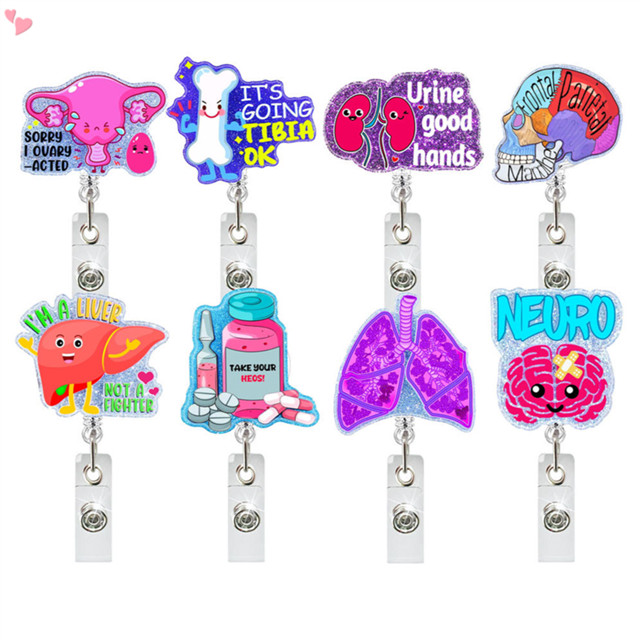 Glitter Acrílico Cérebro Rins Útero Pulmões Crânio Pílula Garrafa Fígado Crachá Carretel Retrátil Jacaré Clipe ID Titula