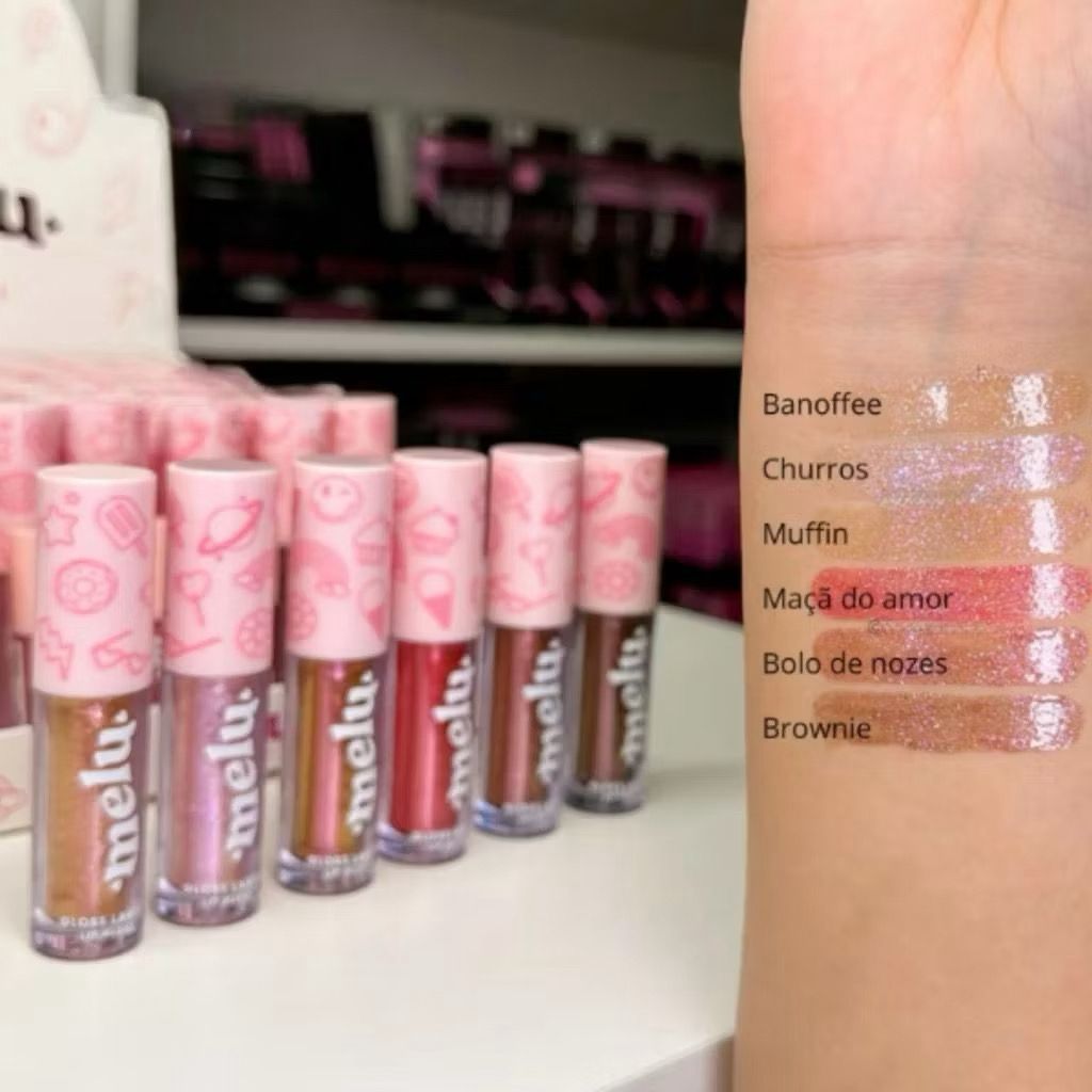 Hidratação labial com muito brilho! Isso você pode encontrar na nova fórmula e novas cores do Gloss Labial da Melu! Cores lindas e brilho holográfico! As cores novas são: - Banoffee - cor mais nude com brilho - Churros - rosinha claro com brilho - Muffin - cor um pouco mais escura que o Banoffee com brilhos rosa - Maça do Amor - rosa mais escuro com brilho - Bolo de nozes - bordô/rosa com brilhos dourados - Brownie - marrom com brilho * Essa é uma tentativa de descrição, porém as cores são bastante holográficas com brilhos coloridos, o que pode tornar a minha percepção destas cores um pouco diferente da sua. Minha sugestão é, conferir a foto com a aplicação de todos os gloss, para ter certeza da cor. Aposte no Gloss da Melu se quer uma maquiagem radiante! Todo mundo vai perguntar que gloss é esse! Vai por mim!