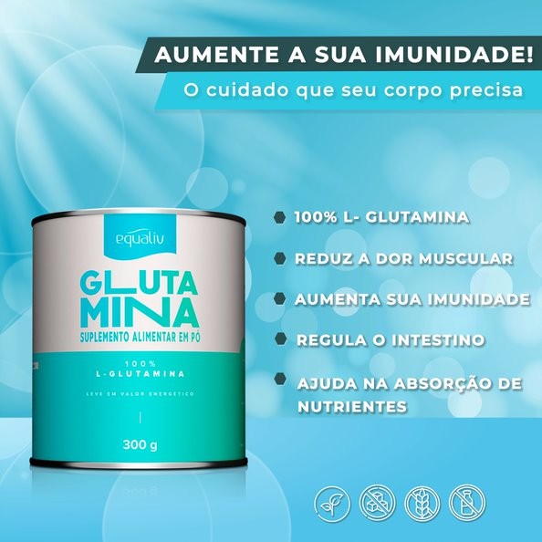 INFORMAÇÕES DE DESTAQUE Suplemento alimentar em pó; Glutamina em Pó 100 % L-Glutamina; Zero açúcar; Zero glúten; Vegano. DESCRIÇÃO Glutamina em Pó 100 % L-Glutamina 300g Equaliv. A Glutamina da Equaliv é um suplemento alimentar em pó. A Glutamina é um dos aminoácidos mais abundantes no corpo humano. Uma precursora de moléculas essenciais que participa de atividades importantes no organismo, incluindo a fabricação de proteínas. COMPOSIÇÃO L-Glutamina. NÃO CONTÉM GLÚTEN. SUGESTÃO DE USO Diluir 5g (1 colher de chá) em 100ml de água ou bebida de sua preferência.