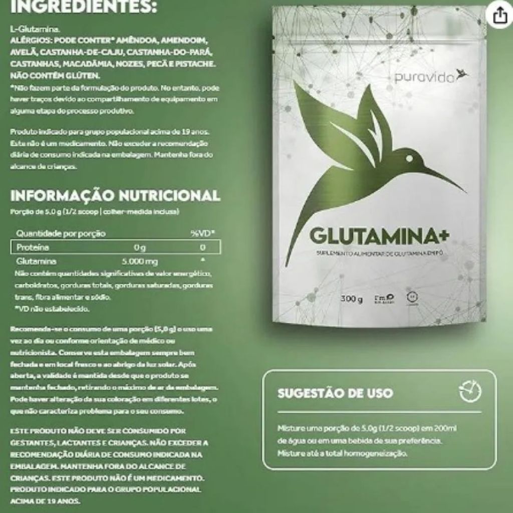 1x L- Glutamina Premium Vegan 300g Sabor Neutro - Pura VidaDescrição do AnuncioUma nutrição equilibrada tem um papel muito importante na qualidade de vida. Com o ritmo acelerado de muitas pessoas, às vezes, é muito difícil prestar atenção a todos os requisitos que o corpo precisa para estar saudável e forte. Neste sentido, os suplementos cumprem a função de complementar a alimentação e ajudam a obter as vitaminas, minerais, proteínas e outros componentes indispensáveis para o correto funcionamento do organismo.Suplemento esportivoEsse tipo de suplemento ajuda a complementar a alimentação de pessoas com objetivos ou requisitos nutricionais específicos. Seu consumo pode ser indicado por vários fatores, como a duração e a intensidade da atividade física, o tipo de esporte, o ambiente em que é praticado, a idade, a composição corporal, o peso, etc. É importante destacar que seu uso deve ser acompanhado por uma alimentação equilibrada e hábitos de vida saudáveis.Recomendado para esportes intensivosO consumo de aminoácidos como complemento de uma alimentação saudável e exercício físico intenso pode ajudar a reduzir a fadiga muscular. É um dos suplementos com mais benefícios para uma nutrição esportiva completa sendo recomendado para ser usado durante ou após a atividade física para promover a recuperação muscular e fortalecer o sistema imunológico.INGREDIENTES:L-Glutamina.ALÉRGIOS: PODE CONTER* AMÊNDOA, AMENDOIM, AVELÃ, CASTANHA-DE-CAJU, CASTANHA-DO-PARÁ, CASTANHAS, MACADÂMIA, NOZES, PECÃ E PISTACHE. NÃO CONTÉM GLÚTEN.*Não fazem parte da formulação do produto. No entanto, pode haver traços devido ao compartilhamento de equipamento em alguma etapa do processo produtivo.Produto indicado para grupo populacional acima de 19 anos. Este não é um medicamento. Não exceder a recomendação diária de consumo indicada na embalagem. Mantenha fora do alcance de criançasRecomenda-se o consumo de uma porção (5,0 g) o uso uma vez ao dia ou conforme orientação de médico ou nutricionista. Conserve esta embalagem sempre bem fechada e em local fresco e ao abrigo da luz solar. Após aberta, a validade é mantida desde que o produto se mantenha fechado, retirando o máximo de ar da embalagem. Pode haver alteração da sua coloração em diferentes lotes, o que não caracteriza problema para o seu consumo.SUGESTÃO DE USOMisture uma porção de 5,0g (1/2 scoop) em 200mlde água ou em uma bebida de sua preferência.Misture até a total homogeneização.*Este produto é um suplemento dietético, não é um medicamento. Suplementa Ante dietas insuficientes. Consulte seu médico e / ou farmacêutico.