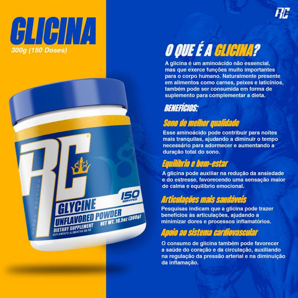 COMPRE COM SEGURANÇA ENVIO IMEDIATO PRODUTO ORIGINAL IMPORTADO VALIDADE: 09/2027 Glicina 300g – Ronnie Coleman Pura e de Alta Qualidade A Glicina é um aminoácido fundamental para o organismo, conhecido por seu papel na formação de proteínas, colágeno e na melhora da qualidade do sono. Apesar de ser produzida pelo corpo, a suplementação pode trazer diversos benefícios para saúde, bem-estar e desempenho físico. Benefícios da Glicina Melhora a qualidade do sono e promove relaxamento. Auxilia na síntese de colágeno, fortalecendo pele, unhas, cabelos, articulações e ossos. Contribui para a formação de creatina, apoiando energia, força e desempenho muscular. Importante na produção de glutationa, um poderoso antioxidante natural do organismo. Apoia a função cognitiva e concentração. Sugestão de Consumo Consumir 2g ao dia, diluídas em água ou na bebida de sua preferência, ou conforme recomendação de nutricionista ou médico. Informações do Produto Quantidade: 300g Rendimento médio: 150 doses Ingrediente único: Glicina Pura Não contém glúten. Aposte na Glicina e conquiste mais saúde, disposição e qualidade de vida!