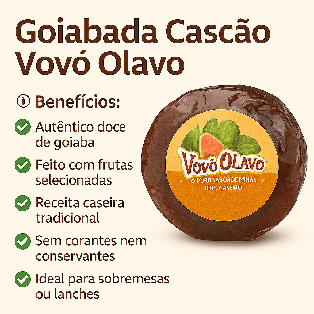 A Goiabada Cascão Vovô Olavo é produzida com goiabas selecionadas, mantendo a tradição da família mineira há mais de 50 anos. Com textura firme e pedacinhos de fruta, sua versão em barra é perfeita para quem busca o sabor autêntico da goiabada artesanal, ideal para consumo com queijos, pães ou no preparo de receitas. Prática e deliciosa, a embalagem de 400g é perfeita para o dia a dia. ℹ️ Benefícios: ✅ Textura firme com pedacinhos de fruta ✅ Receita artesanal com tradição mineira ✅ Ideal para consumo direto ou em receitas ✅ Embalagem em barra – fácil de cortar e porcionar ✅ Sabor intenso e equilibrado de goiaba ℹ️ Ficha Técnica: ✅ Produto: Goiabada Cascão Barra ✅ Marca: Vovô Olavo ✅ Peso: 400g ✅ Embalagem: Barra embalada em filme transparente ✅ Ingredientes: Goiaba e açúcar ✅ Glúten: Não contém ✅ Origem: Ponte Nova – Minas Gerais