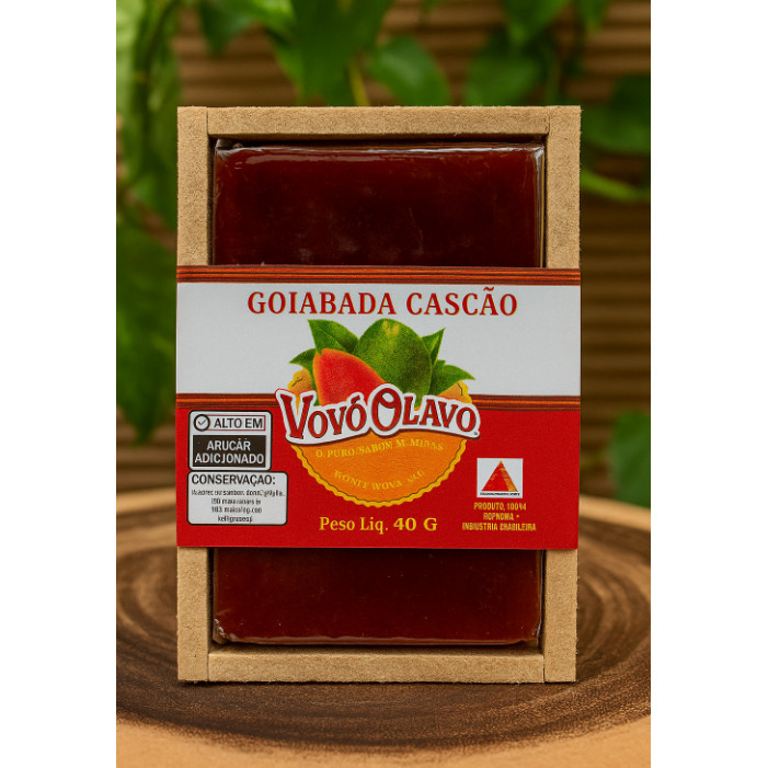 Goiabada Cascão Vovô Olavo – 40g | Sabor de Minas na Caixinha de Madeira A verdadeira goiabada mineira com pedacinhos da casca da goiaba e sabor intenso! A Goiabada Cascão Vovô Olavo é feita em Ponte Nova – MG, com goiabas selecionadas e embalagem especial em caixinha de madeira, perfeita para presentes, kits e lembrancinhas com um toque rústico e elegante. ℹ️ Benefícios: ✅ Com casquinhas de goiaba ✅ Embalagem em caixinha de madeira – ideal para presente ✅ Produto de Ponte Nova – MG ✅ Embalagem individual de 40g ✅ Produto 100% mineiro ℹ️ Ficha Técnica: ✅ Produto: Goiabada cascão artesanal ✅ Marca: Vovô Olavo ✅ Peso líquido: 40g ✅ Ingredientes: Polpa e casca de goiaba, açúcar ✅ Embalagem: Caixinha de madeira ✅ Armazenamento: Local seco e fresco ✅ Origem: Ponte Nova – MG *Imagens Ilustrativas