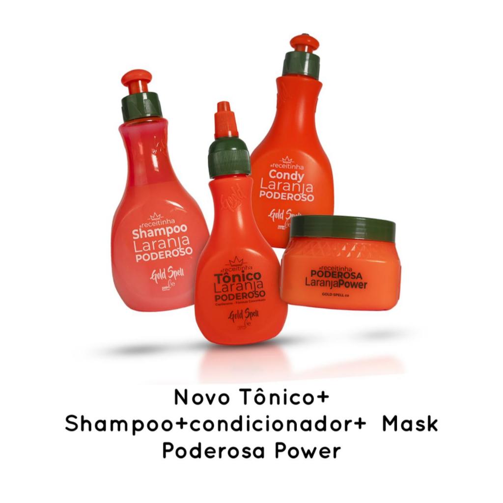 Novo Kit Poderoso Power... Comprovadamente 90% mais eficaz que qualquer outro produto. O kit é composto por: Tonico Poderoso Power Shampoo Poderoso Power Condicionador Poderoso Power Máscara Poderosa Power Tônico Laranja Poderoso é um cuidado avançado para o couro cabeludo que une performance comprovada e experiência sensorial refinada. Desenvolvido para atuar diretamente na raiz, ele desperta o couro cabeludo, revitaliza os fios e transforma a rotina de tratamento em um ritual de força e renovação. Sua fórmula concentrada combina ativos botânicos, vitaminas, aminoácidos e peptídeos que estimulam o couro cabeludo, favorecem o crescimento saudável e ajudam a reduzir visivelmente a queda capilar. O toque refrescante ativa a circulação local e cria uma sensação imediata de frescor e energia, enquanto a textura leve é rapidamente absorvida, sem pesar ou deixar resíduos. Com eficácia comprovada em testes, o Tônico Laranja Poderoso entrega resultados reais. Shampoo Laranja Poderoso é uma experiência de cuidado que começa no toque e permanece no resultado. Sua fórmula hidratante envolve os fios com uma limpeza equilibrada, deixando o cabelo visivelmente mais macio, solto e luminoso desde a primeira aplicação. A textura cremosa desliza facilmente, formando uma espuma suave e envolvente, enquanto a fragrância marcante desperta os sentidos e deixa os cabelos delicadamente perfumados. Ideal para quem busca hidratação, leveza e um toque de luxo no cuidado diário, sem abrir mão de performance e prazer. Condicionador Laranja Poderoso foi criado para transformar o cuidado diário em um momento de nutrição intensa e prazer sensorial. Sua fórmula hidratante envolve os fios desde a primeira aplicação, selando a umidade e devolvendo maciez, alinhamento e brilho com naturalidade. A textura cremosa desliza com facilidade, promovendo toque aveludado e acabamento impecável, enquanto a fragrância envolvente permanece delicadamente nos fios. Ideal para quem busca hidratação, disciplina e uma sensação de cabelo tratado, bonito e saudável todos os dias. Mask Laranja Power é um tratamento intensivo que entrega resultado visível e sensação de cabelo transformado desde a primeira aplicação. Sua fórmula concentrada envolve os fios profundamente, restaurando maciez, força e brilho com um toque luxuoso e imediato. Com um blend poderoso de óleos nutritivos como argan, coco, macadâmia, amêndoas, linhaça e moringa, aliados à queratina hidrolisada, a máscara age na fibra capilar, devolvendo vitalidade, resistência e aspecto saudável. Os extratos florais de lótus, gardênia do Taiti, camomila, rosa mosqueta e açafrão elevam o cuidado, trazendo suavidade, conforto e uma experiência sensorial sofisticada.
