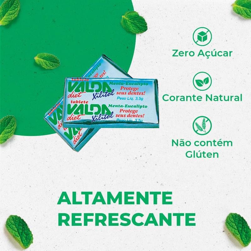 A goma de mascar da Valda são preparadas com ingredientes naturais selecionados, que proporcionam um hálito puro, perfumado e fresco. Os Tabletes Valda são veganos, pois não possuem em sua composição nenhum ingrediente de origem animal. É também, uma opção ideal para pessoas com intolerância ao glúten ou lactose. Seu tamanho compacto permite que você carregue consigo para qualquer lugar e em qualquer momento do dia a dia.
