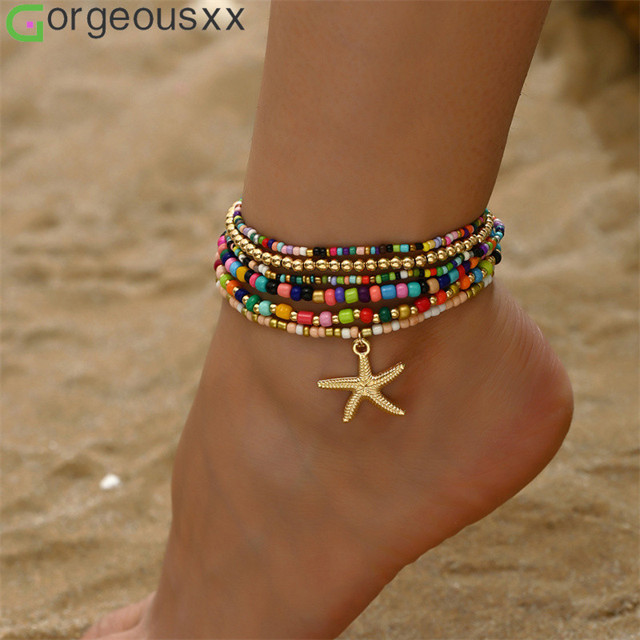 [Gorgeousxx] Conjunto De Tornozeleiras Boêmias Multicamadas Com Contas De Arroz Para Mulheres , Joias Pingente De Estrel