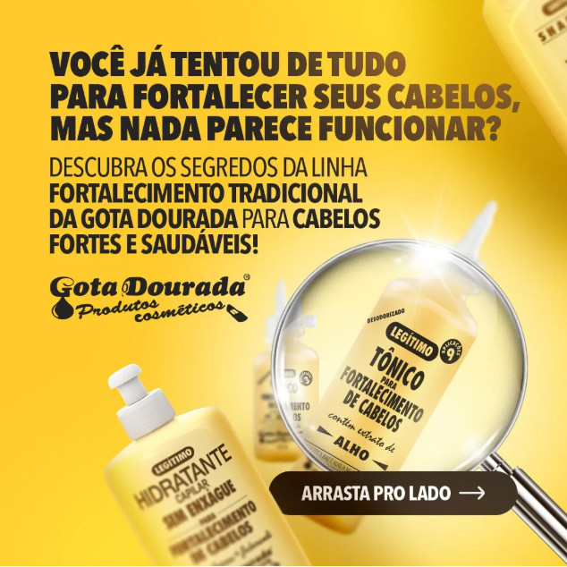 O Shampoo Fortalecimento Tradicional Gota Dourada 430 ml é a solução ideal para quem busca cabelos mais fortes, saudáveis e brilhantes. Com uma fórmula poderosa, que inclui ingredientes como extrato de alho, óleo de alho, extrato de aloe vera, piritionato de zinco e extrato de jaborandi, ele combate a queda, a oleosidade e a caspa, devolvendo a vitalidade aos seus fios. Este shampoo é indicado para todos os tipos de cabelo. Benefícios do Shampoo Fortalecimento Tradicional Gota Dourada 430 ml Fortalece as raízes, proporcionando cabelos mais resistentes. Ação antiqueda e antioleosidade, mantendo o couro cabeludo saudável. Combate a caspa com a ajuda do piritionato de zinco. Hidrata e nutre os fios, proporcionando brilho e maciez. Indicado para todos os tipos de cabelo, desde os mais finos aos mais volumosos. Composição e Ingredientes do Shampoo Fortalecimento Tradicional Gota Dourada 430 ml A fórmula do Shampoo Fortalecimento Tradicional Gota Dourada 430 ml é especialmente desenvolvida para proporcionar fortalecimento e saúde capilar. Confira os principais ingredientes: Extrato de alho e óleo de alho: atuam diretamente no bulbo capilar, promovendo o fortalecimento e favorecendo o crescimento saudável dos fios. Extrato de aloe vera (babosa): ajuda no tratamento antiqueda e na hidratação dos cabelos. Piritionato de zinco: controla a caspa e alivia a coceira do couro cabeludo com sua ação antifúngica e bactericida. Extrato de jaborandi: combate a queda e nutre os cabelos, fortalecendo-os ao longo do tempo. Modo de Usar o Shampoo Fortalecimento Tradicional Gota Dourada 430 ml O Shampoo Fortalecimento Tradicional Gota Dourada 430 ml é fácil de usar. Para obter os melhores resultados, siga estas etapas: Aplique uma quantidade adequada de shampoo nos cabelos molhados. Massageie o couro cabeludo suavemente até formar espuma. Deixe a espuma agir por 1 minuto e enxágue bem. Se necessário, repita o processo. A decantação que pode ocorrer no fundo da embalagem é natural e não interfere na qualidade do produto. Precauções ao Usar o Shampoo Fortalecimento Tradicional Gota Dourada 430 ml Não use o shampoo para remover tinturas ou outros produtos químicos. Mantenha o produto fora do alcance das crianças. Em caso de contato com os olhos, lave com água abundante. Se houver irritação, suspenda o uso. Uso externo apenas. Não ingerir.
