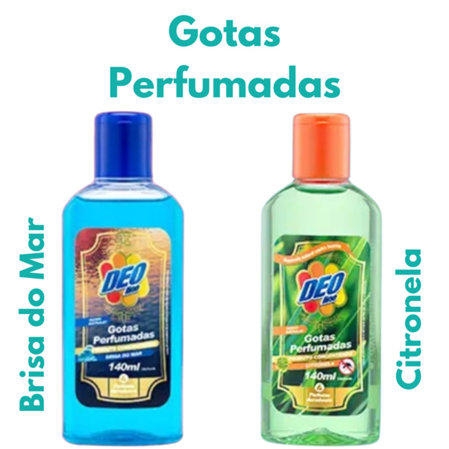 GOTAS PERFUMADAS – CITRONELA O Deoline Gotas Perfumadas – Citronela é um produto especialmente desenvolvido para deixar o ambiente perfumado por muito mais tempo. Indicado para qualquer ambiente como: shoppings, comércios, residências, etc. A versão citronela afasta naturalmente os insetos, já que é formulado com óleo de citronela, o qual possui propriedade de repelência. Modo de Usar O produto pode ser utilizado puro em ralos, lixeiras, vasos sanitários, cantos das paredes, atrás de móveis e cortinas, etc., aplicando 10 gotas no local desejado ou pode ser diluído. Diluir de 10 a 15 gotas do produto em 1 litro de água. Após a diluição, aplicar o produto no ambiente desejado. GOTAS PERFUMADAS – BRISA DO MAR O Deoline Gotas Perfumadas – Brisa do Mar é um produto especialmente desenvolvido para deixar o ambiente perfumado por muito mais tempo. Indicado para qualquer ambiente como: shoppings, comércios, residências, etc. Modo de Usar O produto pode ser utilizado puro em ralos, lixeiras, vasos sanitários, cantos das paredes, atrás de móveis e cortinas, etc., aplicando 10 gotas no local desejado ou pode ser diluído. Diluir de 10 a 15 gotas do produto em 1 litro de água. Após a diluição, aplicar o produto no ambiente desejado.