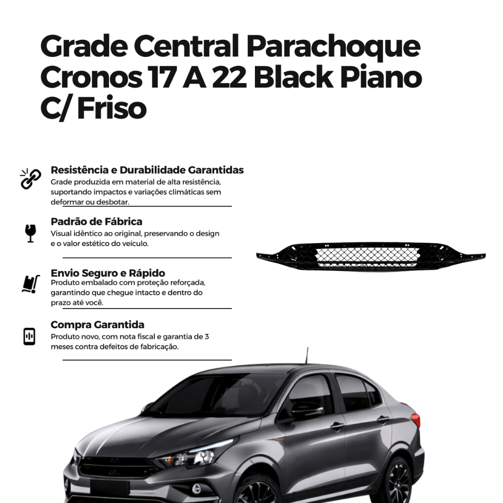 Grade Central do Para-choque Fiat Cronos 2017 a 2022 – Black Piano com Friso Renove o visual frontal do seu Fiat Cronos 2017 a 2022 com esta Grade Central do Para-choque na cor Black Piano com friso, desenvolvida para reposição com encaixe perfeito e acabamento sofisticado. Ideal para substituir grades desgastadas, danificadas ou desbotadas, esta peça devolve ao veículo um visual moderno, elegante e alinhado ao padrão original de fábrica, valorizando a estética frontal com um acabamento de alto padrão. Produzida com material resistente de alta durabilidade e acabamento Black Piano premium, a grade proporciona proteção eficaz ao sistema de ventilação e radiador, impedindo a entrada de sujeira, detritos e pequenos objetos que possam comprometer o fluxo de ar e a refrigeração do motor. O friso integrado ao design confere um toque visual refinado, destacando a dianteira do Cronos com sofisticação. O projeto segue rigorosamente as medidas originais da Fiat, garantindo instalação simples e segura, sem necessidade de adaptações ou ajustes improvisados. A tonalidade Black Piano com friso harmoniza-se de forma equilibrada com os demais elementos frontais — como faróis, para-choque e frisos — preservando o estilo moderno e esportivo do Cronos. Ao substituir a grade danificada por esta versão com acabamento refinado, você melhora tanto a proteção quanto a estética frontal do veículo, valorizando sua aparência para uso diário ou revenda. É a escolha ideal para quem busca qualidade, resistência e acabamento premium, mantendo seu Fiat Cronos sempre em excelente estado de conservação. Compre agora e transforme a dianteira do seu Cronos! Adicione ao carrinho e garanta a Grade Central do Para-choque Black Piano com friso compatível com Fiat Cronos 2017 a 2022. Últimas unidades disponíveis.