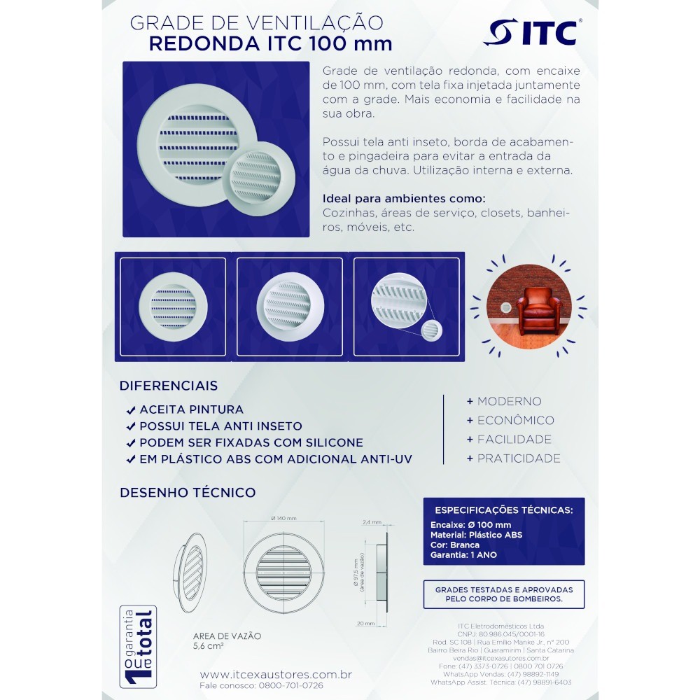 Grade de ventilação plástica para duto de 100 mm - ITC