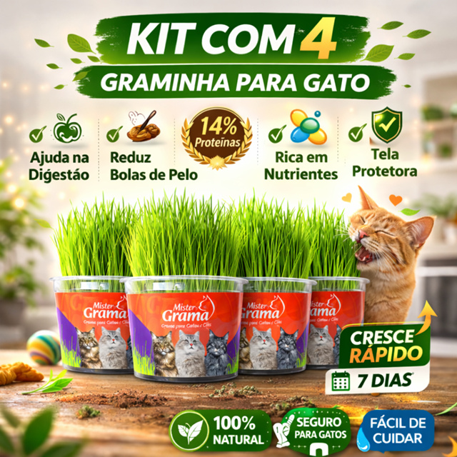 Grama Para Gato Mister C/ 4 Unidades – Auxilia na Digestão e Bola de Pelo / Fácil de Plantar